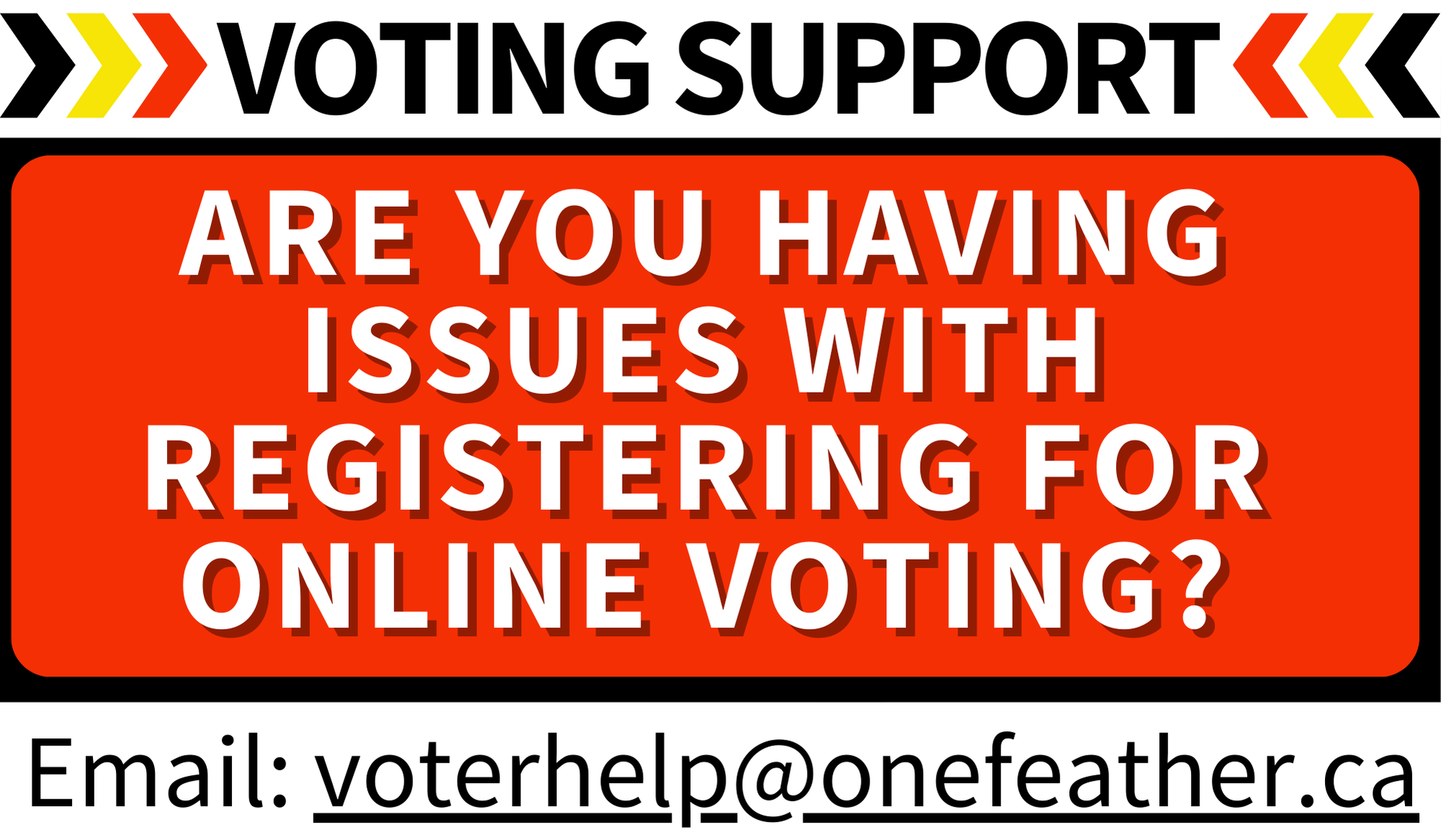 If you are having any issues with registering for online voting, please see the following that outlines the steps to troubleshoot. If you still cannot register to vote, please contact Voter Help by emailing voterhelp@onefeather.ca, or by calling 1-855-923-3006