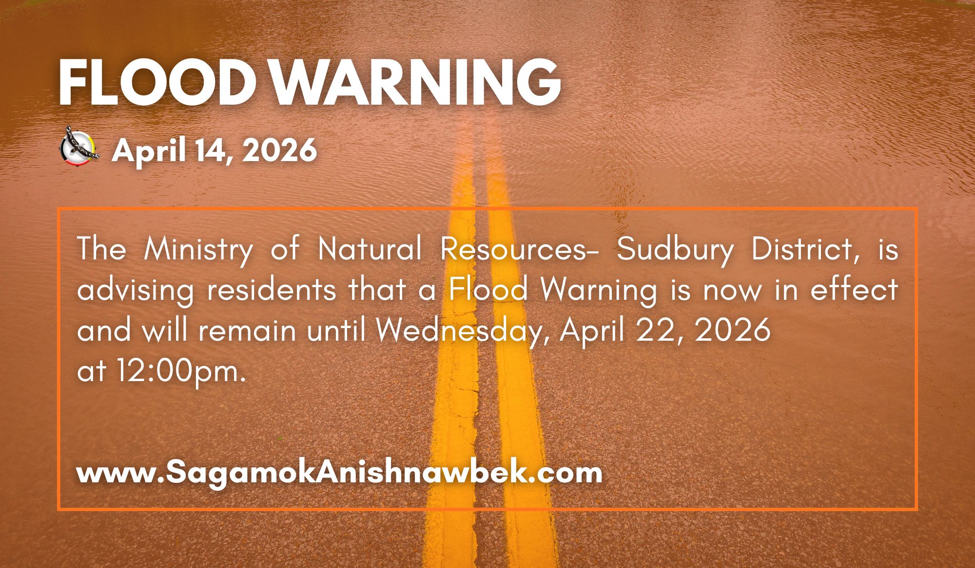 The Ministry of Natural Resources– Sudbury District, is advising residents that a Flood Warning is now in effect and will remain until Wednesday, April 22, 2026 at 12:00pm.