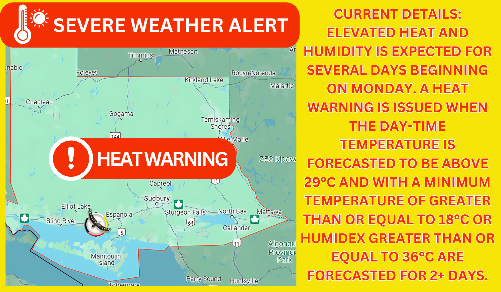 Daytime highs today through Wednesday are expected to be 28 to 33 degrees Celsius with humidex values of 36 to 42. There will be little relief through the overnight as lows are expected to be 17 to 20 degrees Celsius with humidex values of 25 to 30.