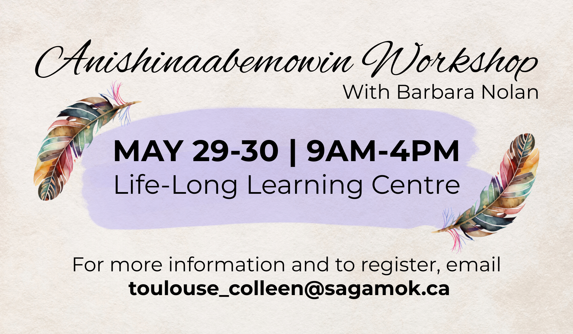 For more information and to register, email Colleen Toulouse at toulouse_colleen@sagamok.ca.