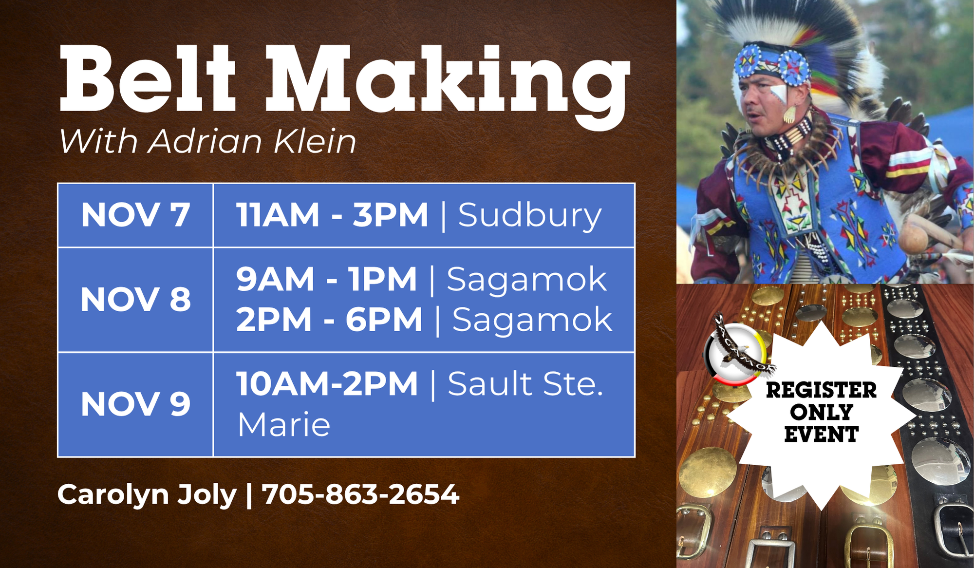 Adrian Klein, a member of the Oneida and Ojibwe nations, has dedicated over 25 years to creating various aspects of dance regalia. Currently, he works in the education sector, supporting Indigenous youth. During the summer months, he travels extensively across Turtle Island to share his Men’s traditional dance style. He is looking forward to collaborating and sharing his skills in leather crafting.