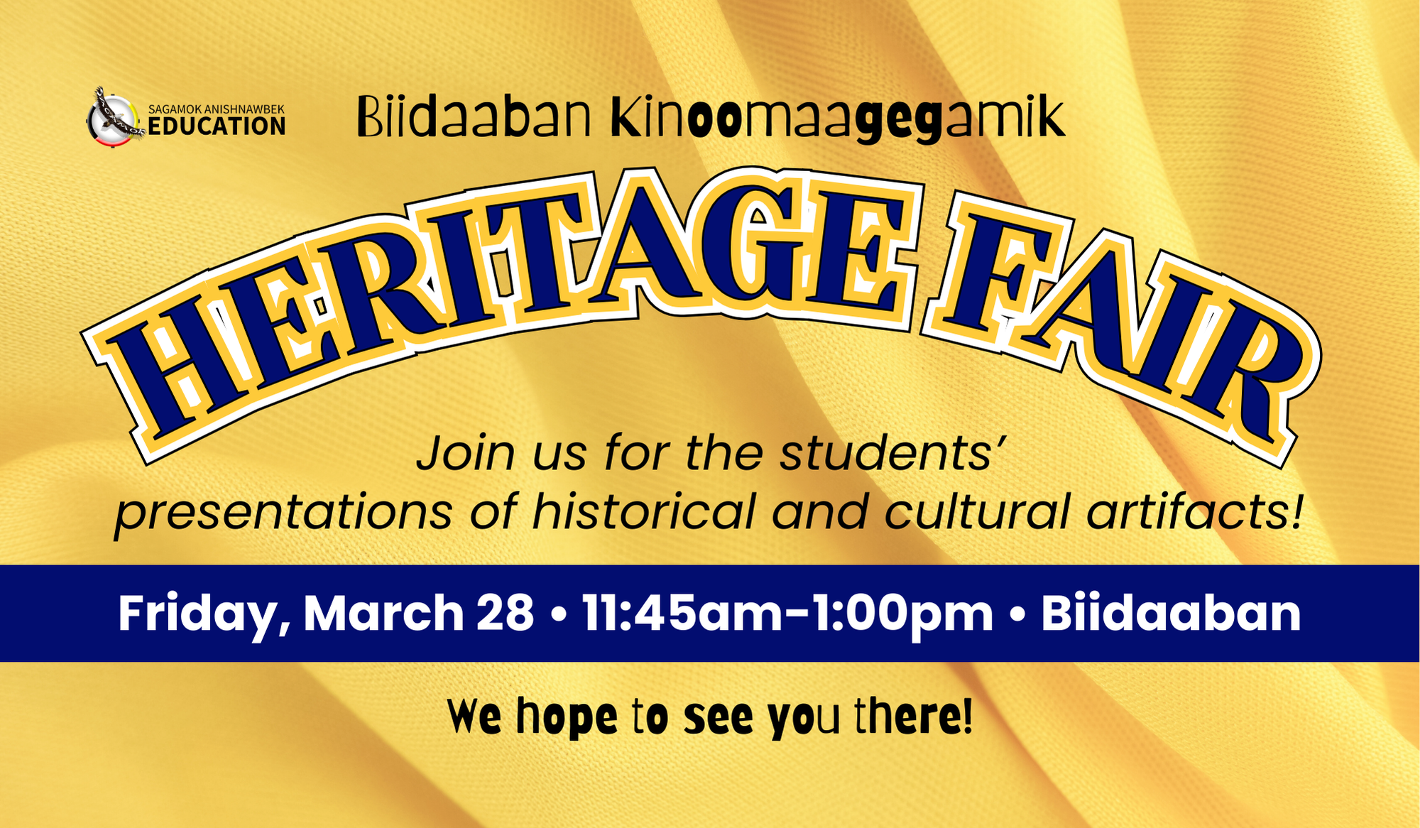Community members are welcome to attend Biidaaban on Friday, March 28 from 11:45am-1:00pm to support students at the 2025 Heritage Fair. Students will be presenting on historical and cultural artifacts.