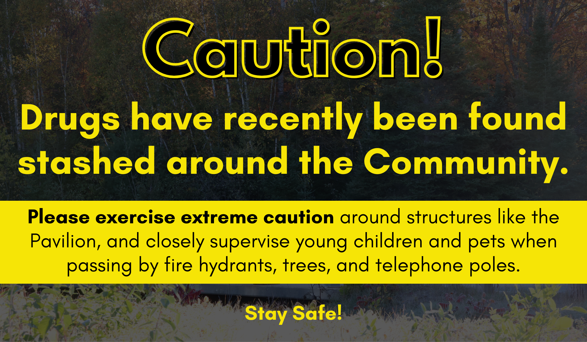 There has been a recent incident where children encountered potentially dangerous, drug-related items near the Pavilion. While thankfully no one was harmed, this underscores the importance of remaining vigilant in all areas of the neighborhood, especially in unsupervised areas. We strongly urge parents, guardians, and pet owners to exercise extreme caution around all public structures and to closely monitor young children and pets at all times when outside.