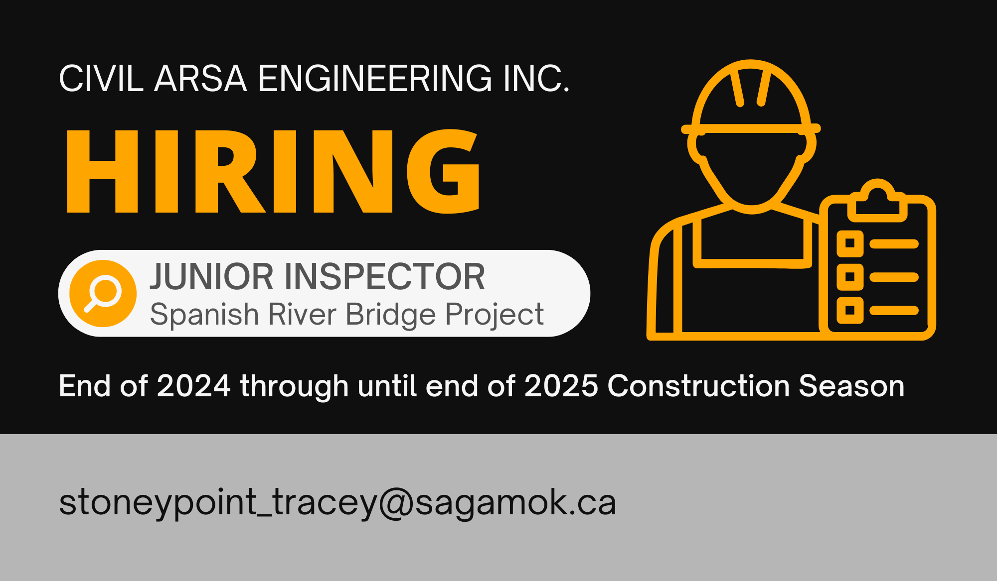 Civil ArSa Engineering Inc. is looking to fill the Junior Inspector position at the Spanish River Bridge Project ASAP for the remainder of the 2024 Construction Season and for the 2025 Construction Season.