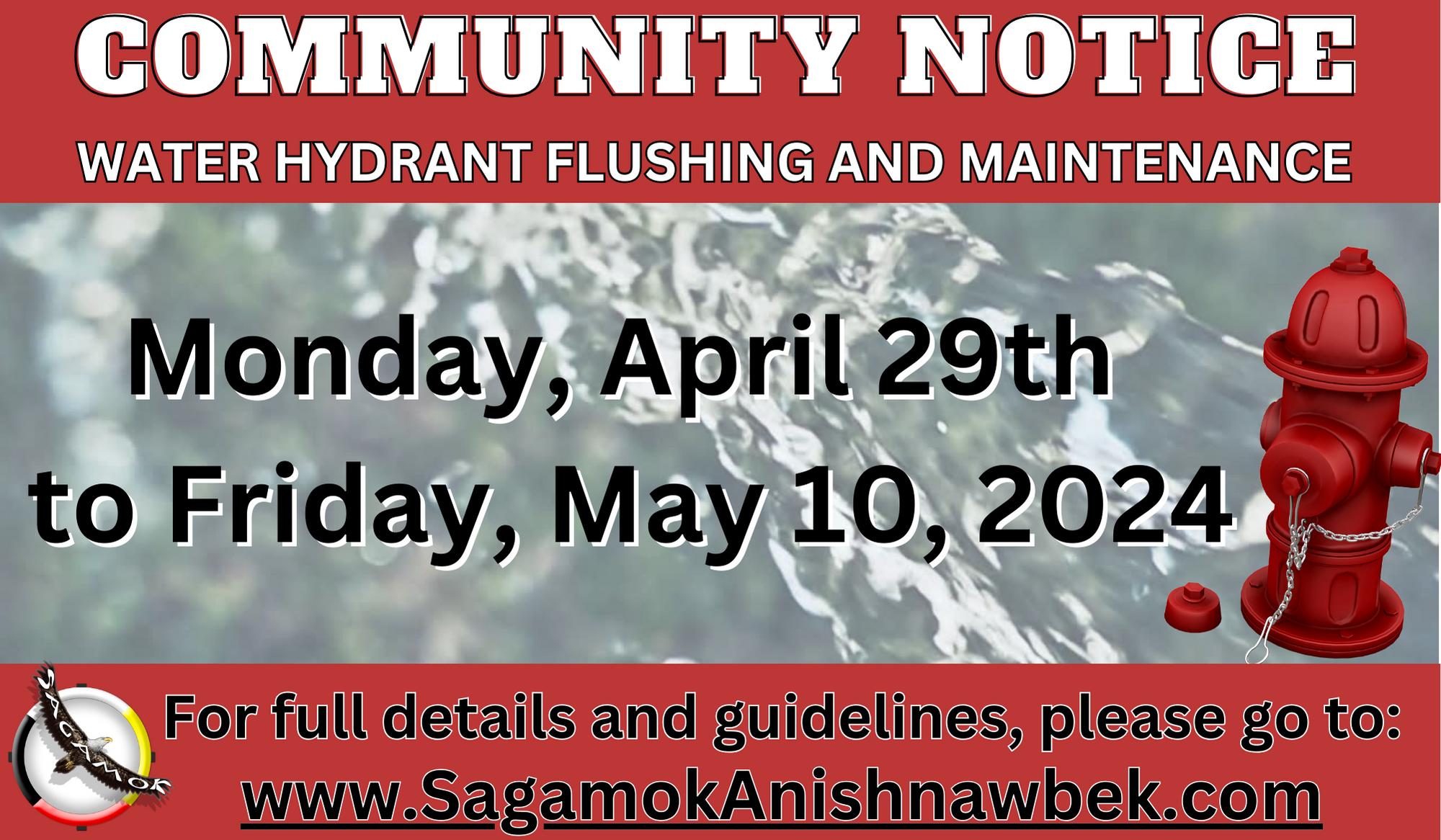 From Monday April 29th to Friday May 10th, 2024 all hydrants throughout the Sagamok Anishnawbek community will be flushed, greased and inspected.