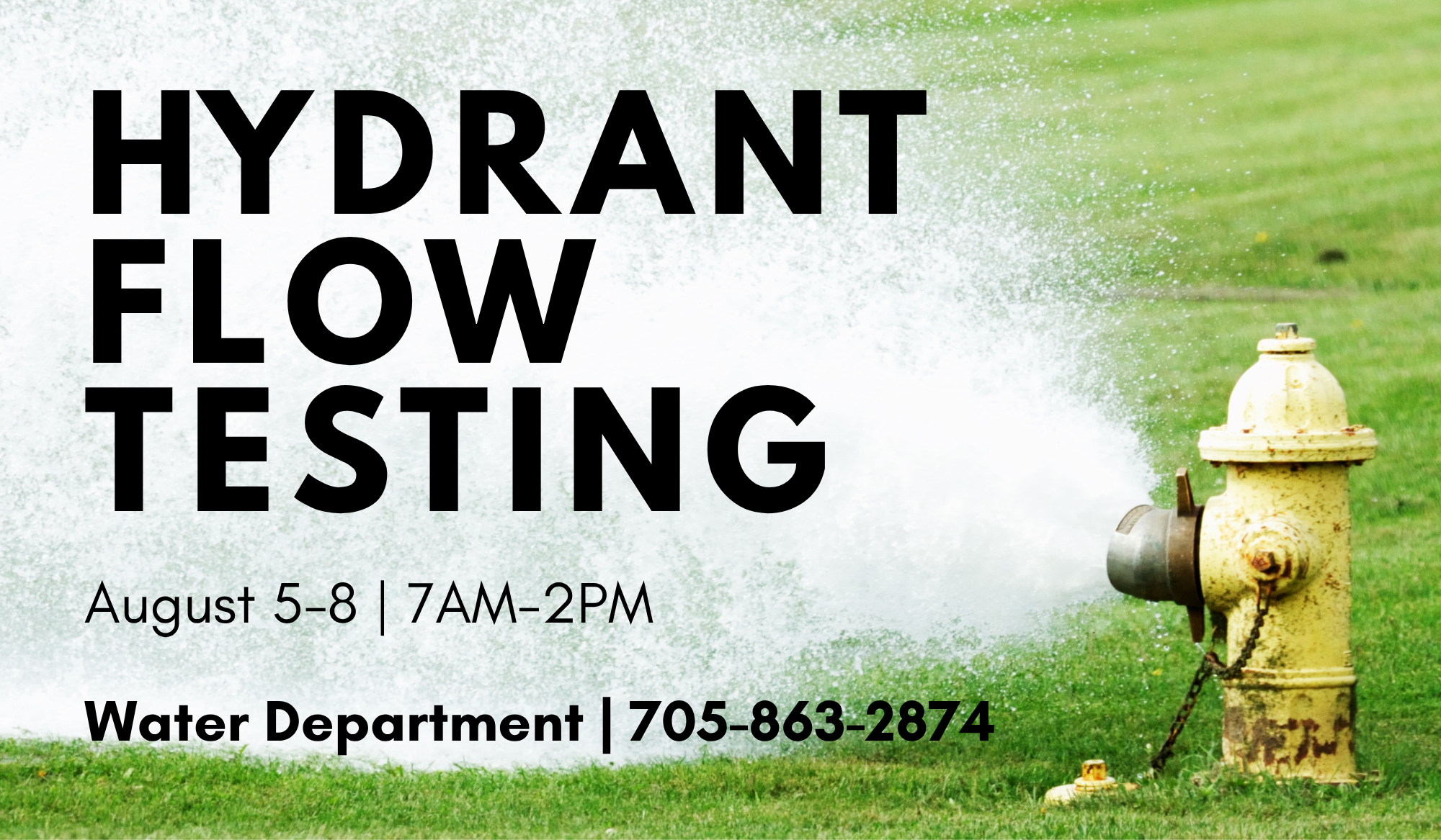 Please be advised that the Water & Sanitation Department will be conducting hydrant flow testing throughout the Sagamok Community from August 5-8, 2025, between the hours of 7:00AM and 2:00PM each day.