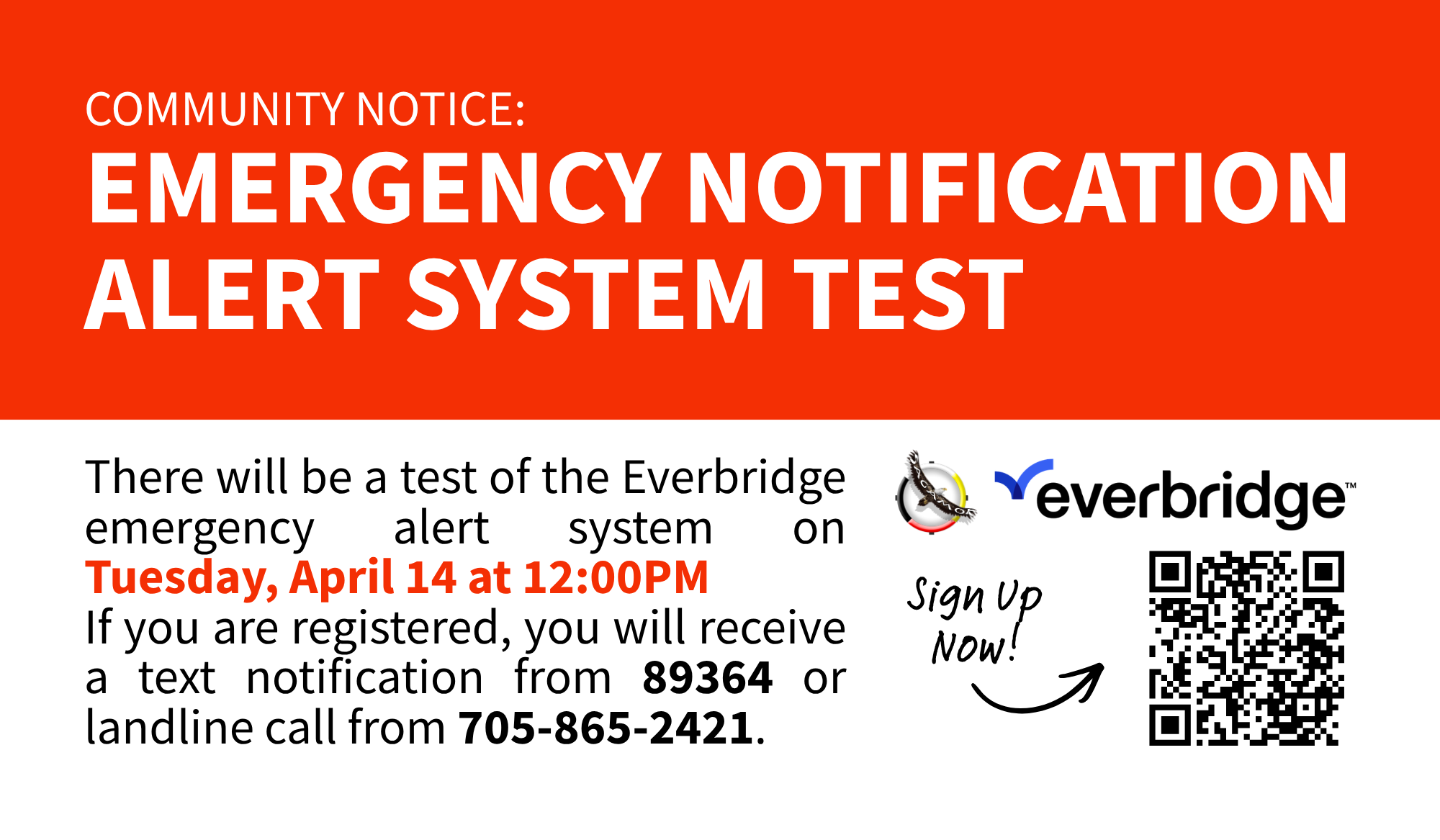 There will be a test of the Everbridge emergency alert system on Tuesday, April 14 at 12:00PM. If you are registered, you will receive a text notification from 89364 or landline call from 705-865-2421.