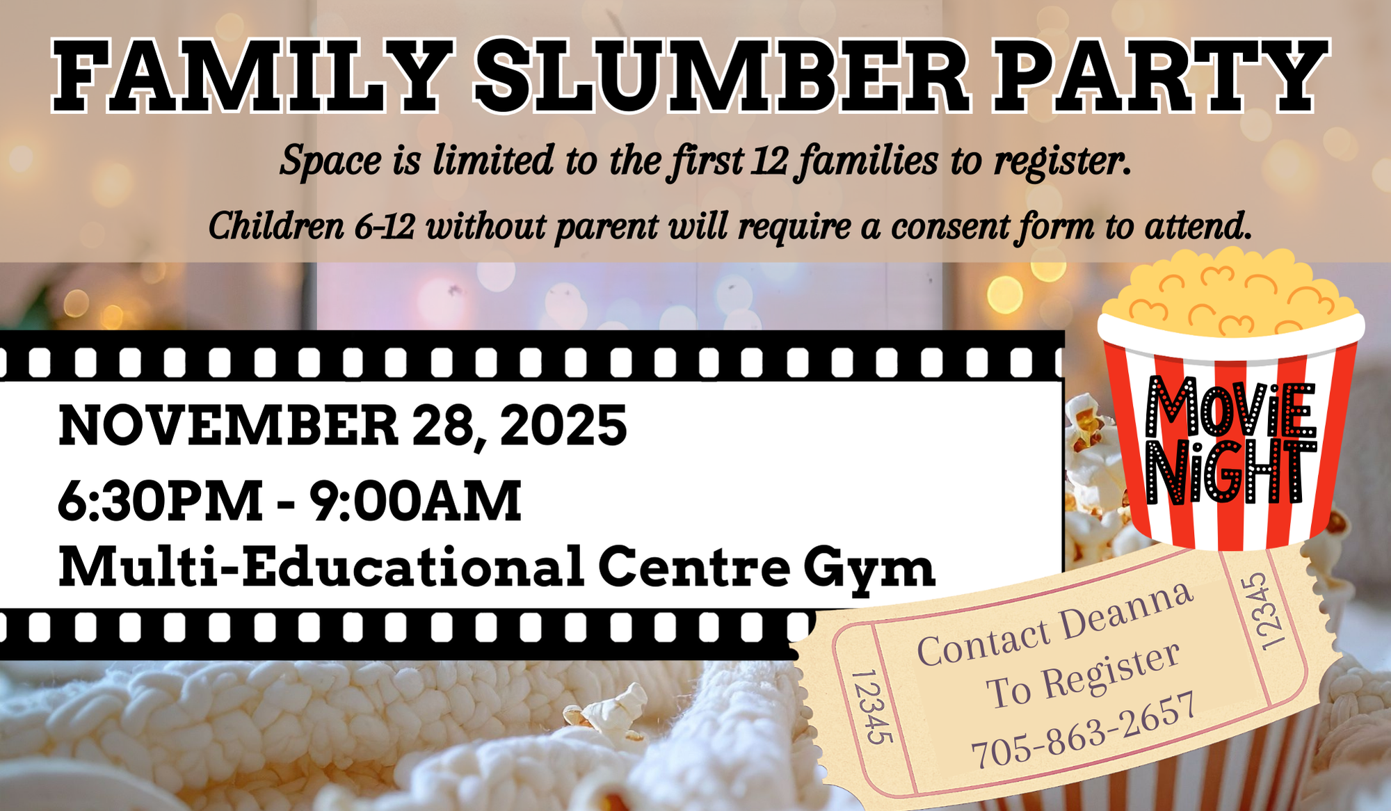 On November 28, 2025 beginning at 6:30pm, there will be a Family Slumber Party held in the gym at the Multi-Educational Centre.
