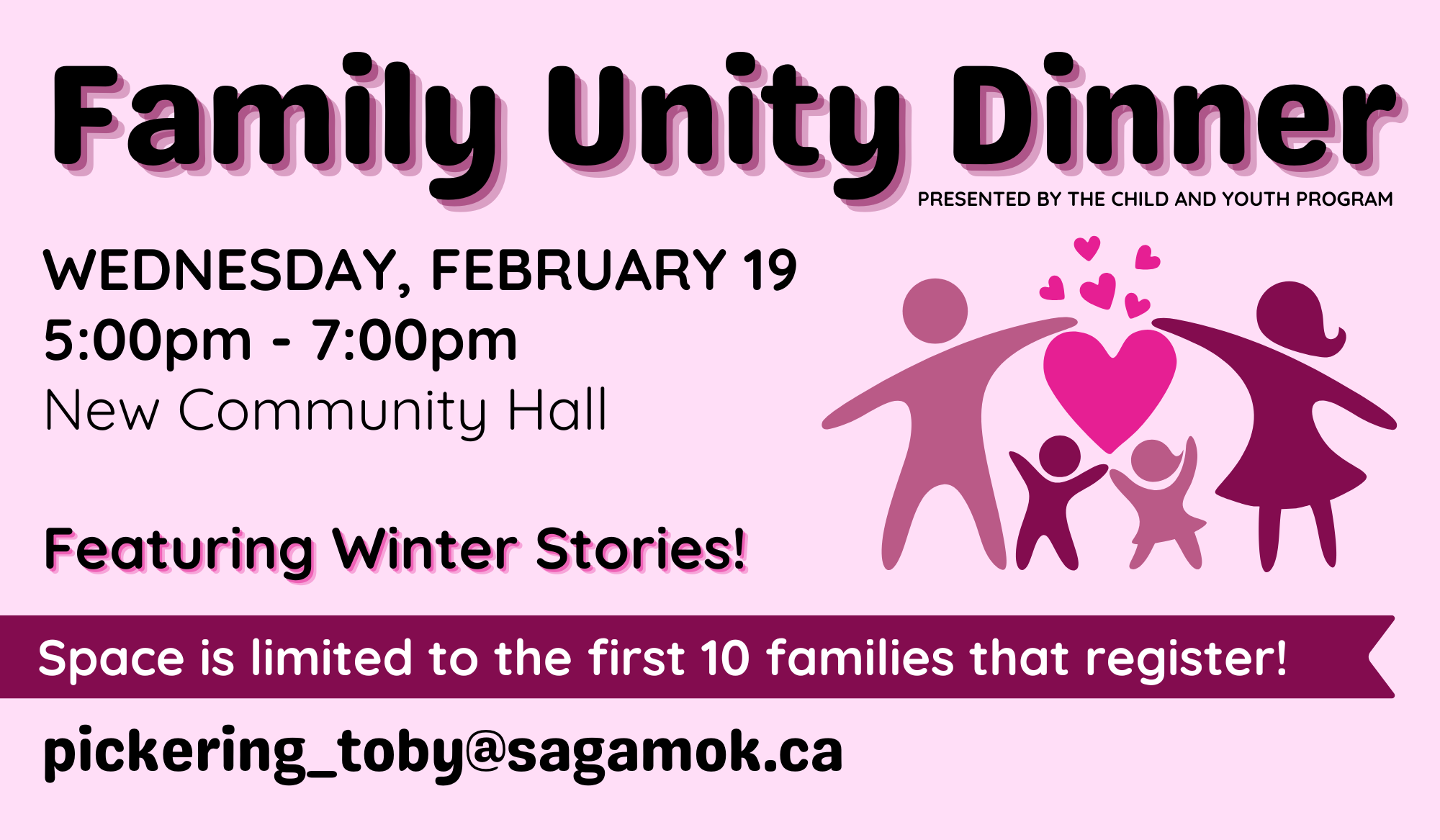 Family meals promote bonding and provide a feeling of security to your children. Join us Wednesday, February 19th from 5-7pm at the New Community Hall.