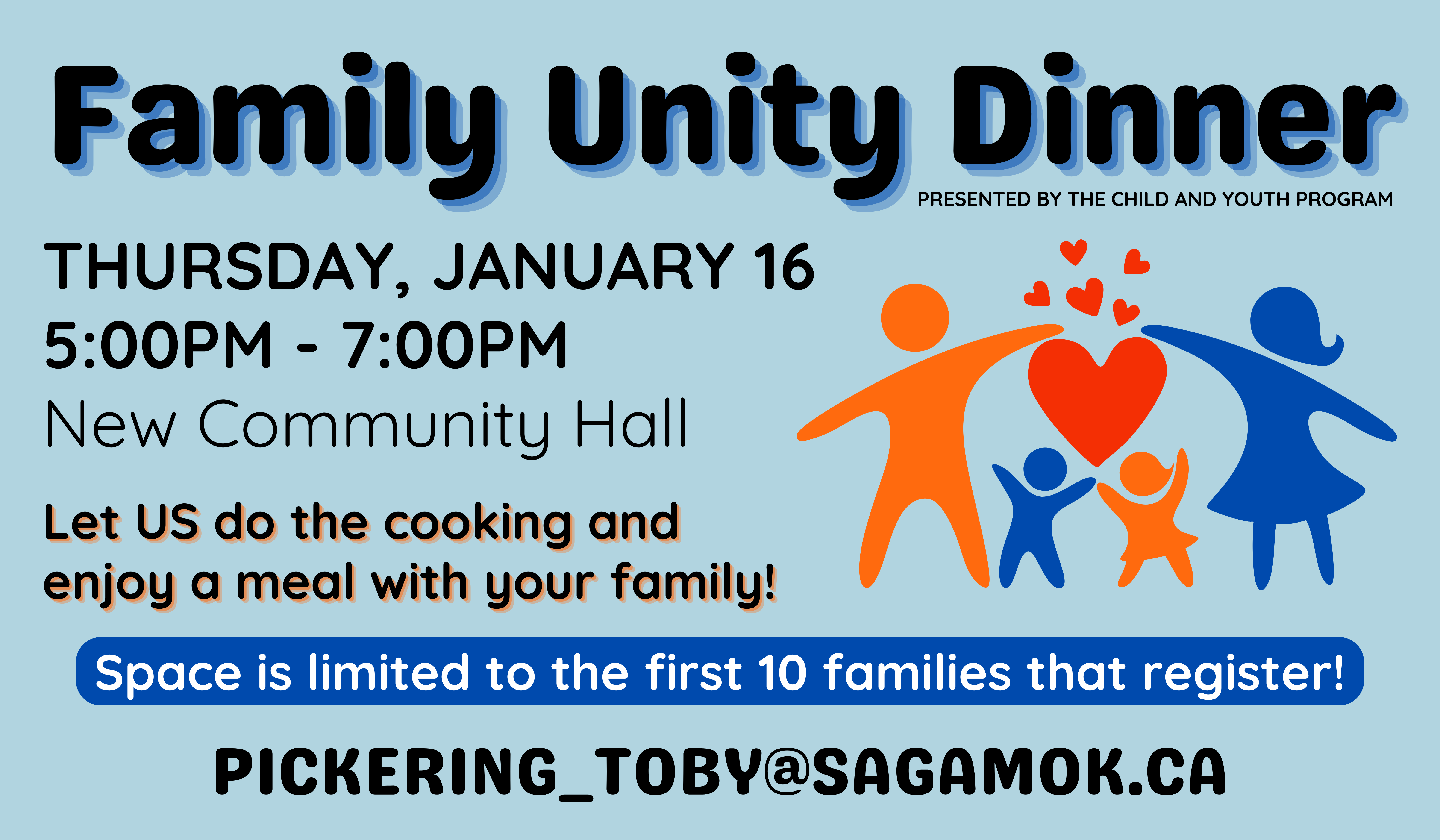 Family meals promote bonding and provide a feeling of security to your children. Join us Thursday, January 16th from 5-7pm at the New Community Hall.