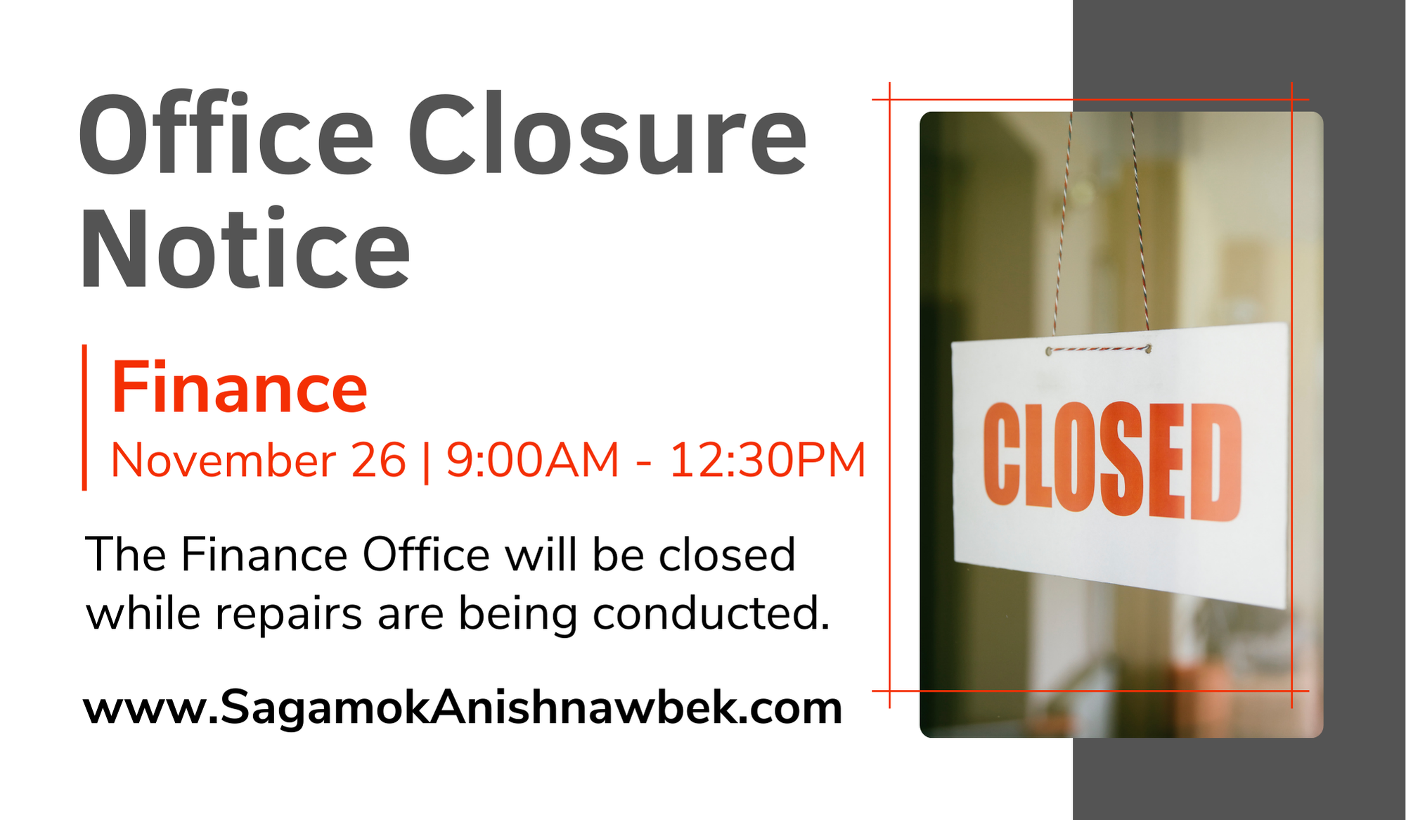 The Finance Office will be closed between 9:00AM and 12:30PM on Wednesday, November 26th, while repairs are being conducted.
