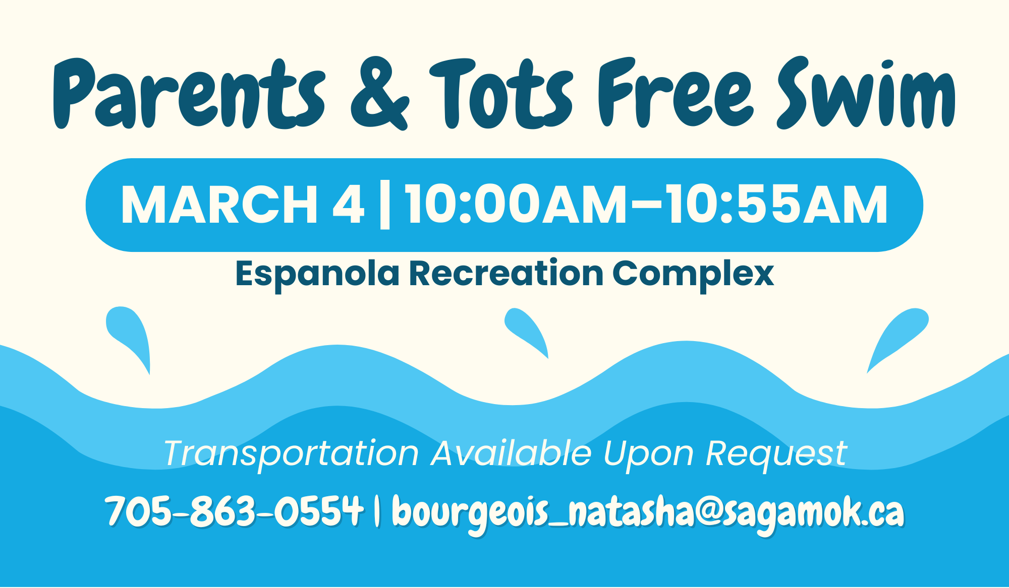 Parents and toddlers can swim for free at the Espanola Recreation Complex on Wednesday, March 4! Transportation is available upon request.
