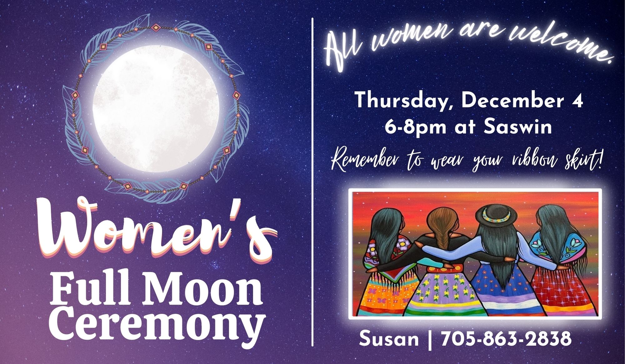 All women are welcome to the Full Moon Ceremony that will be held at Saswin on Thursday, December 4th, 2025 from 6:00pm to 8:00pm.