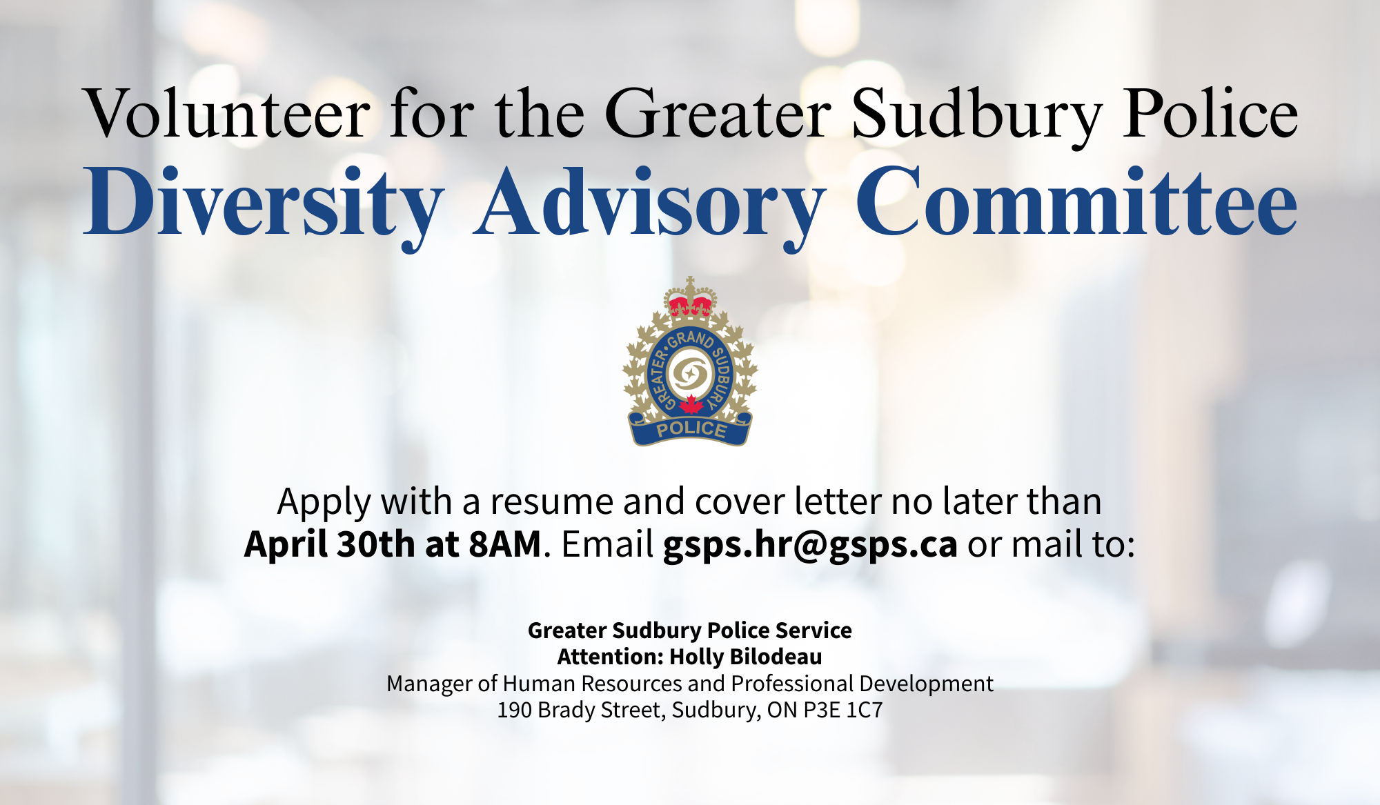 The Greater Sudbury Police Service invites applications from citizens and community organizations interested in participating on the Police Diversity Advisory Committee (DAC).