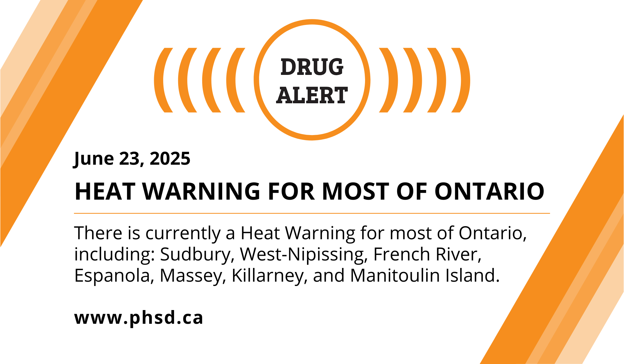 There is currently a Heat Warning for most of Ontario, including: Sudbury, West-Nipissing, French River, Espanola, Massey, Killarney, and Manitoulin Island.
