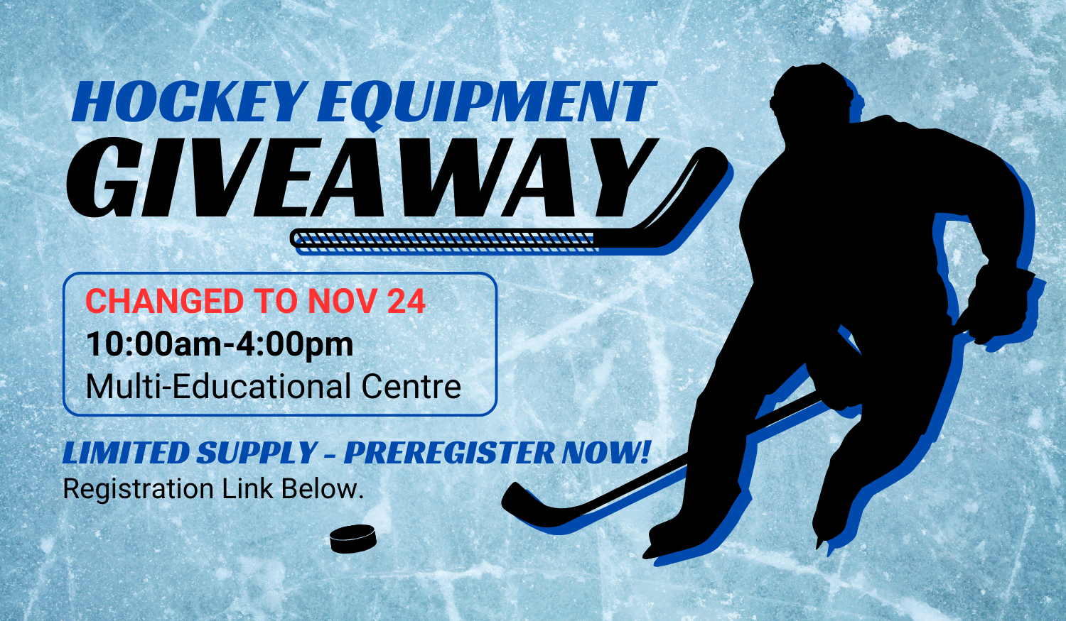 The hockey equipment will be available for anyone interested. Sizes and brands will vary. Equipment will be available as long as supplies last.