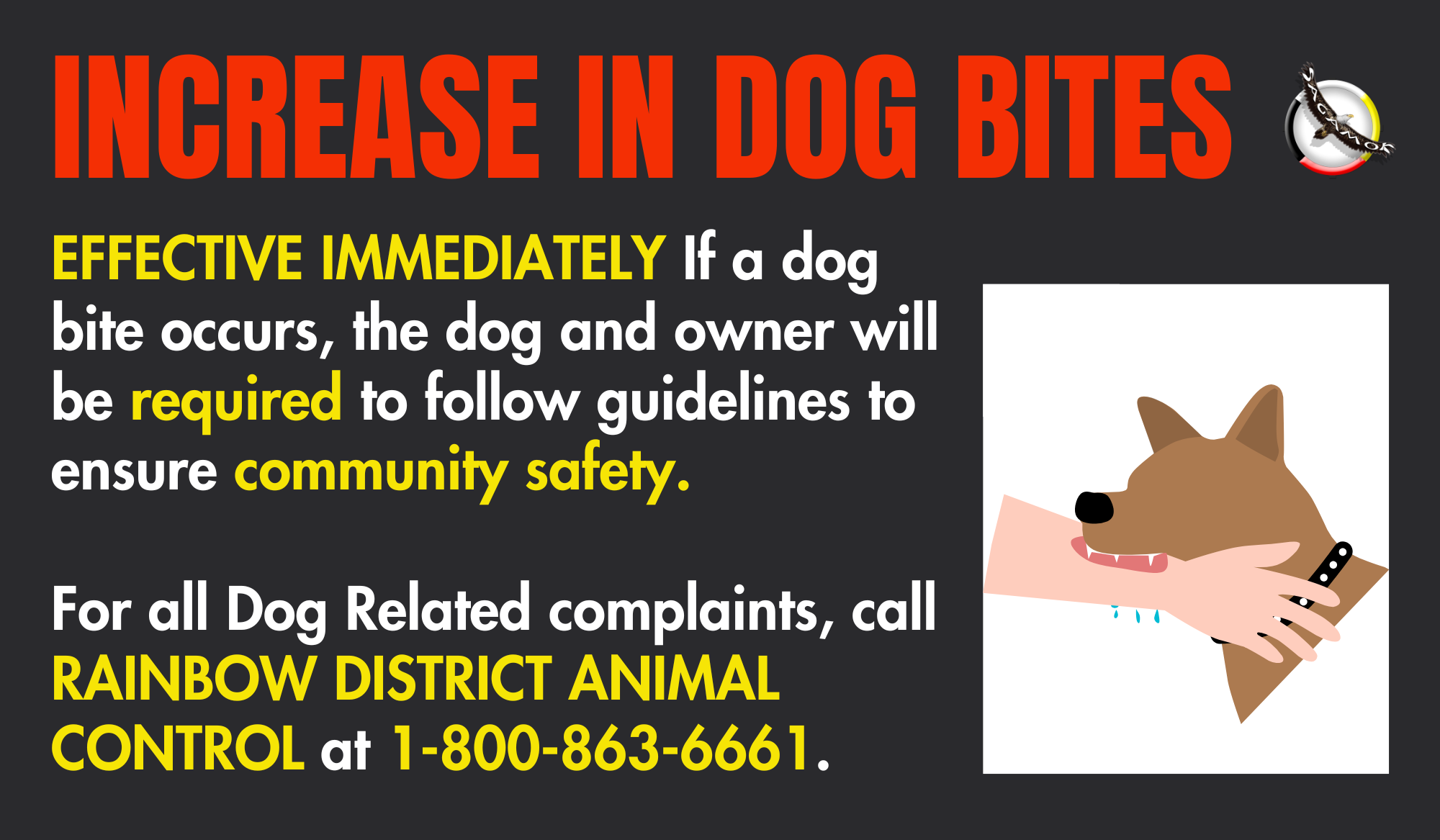 There has been an increase in number of reported dog bites, resulting from an increase of dogs at large. Effective immediately, if a dog bite occurs the dog and owner will be required to follow guidelines to ensure community safety.