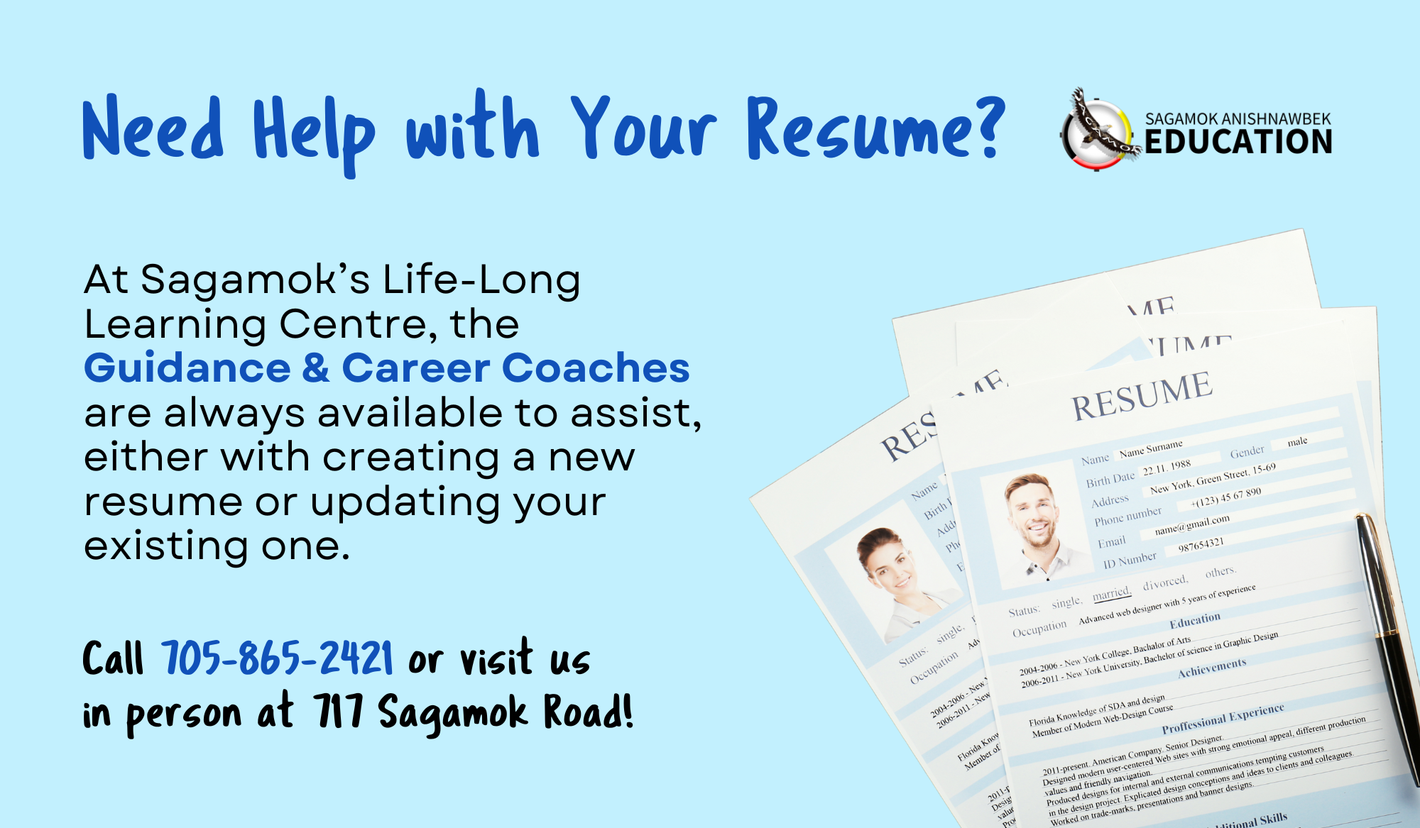 At Sagamok's Life-Long Learning Centre, the Guidance & Career Coaches are always available to assist, either with creating a new resume or updating your existing one.