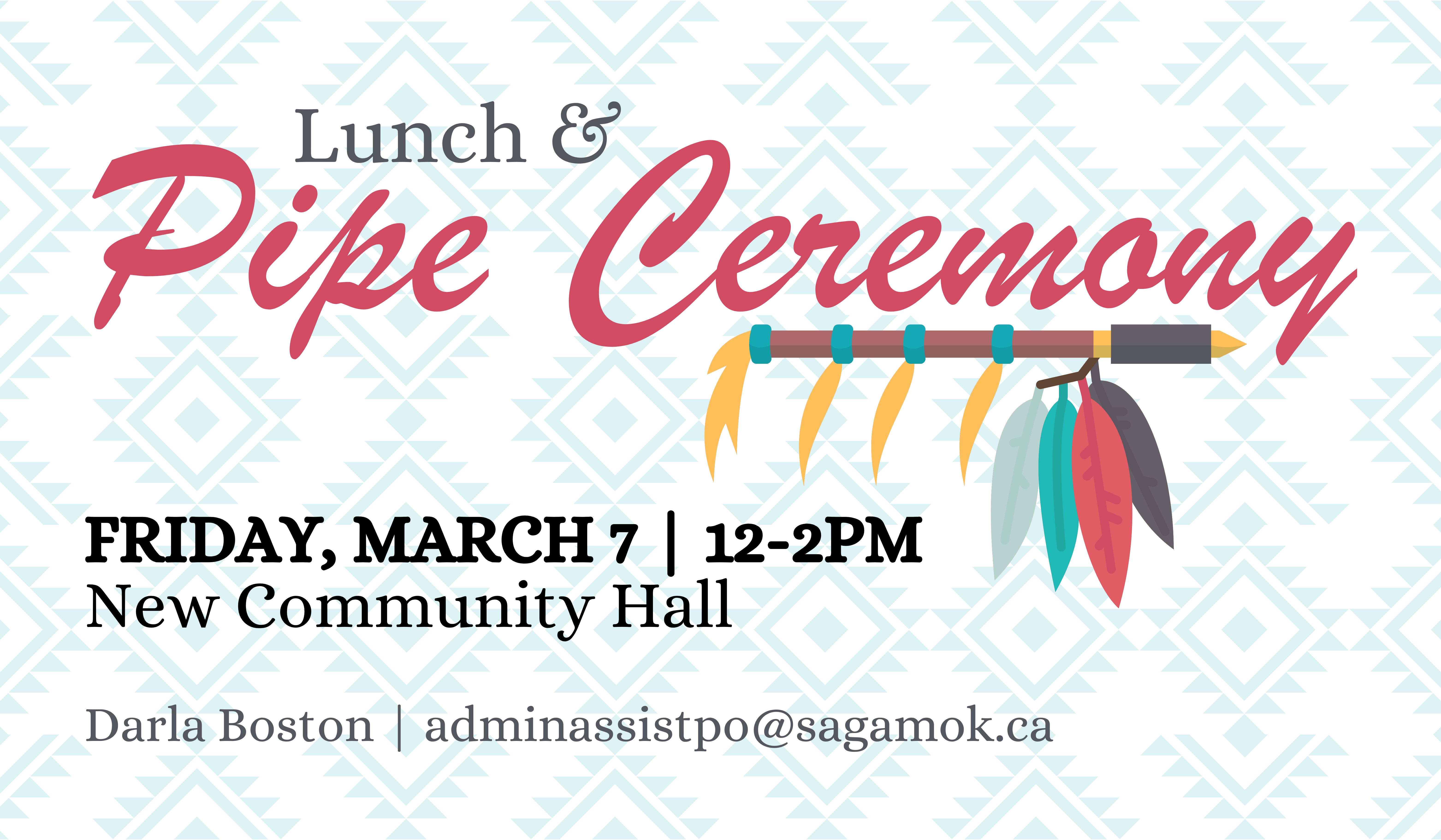On Friday, March 7 there will be lunch and a pipe ceremony from 12-2pm at the New Community Hall, in prayer of safe travels for families during March Break. All are welcome.