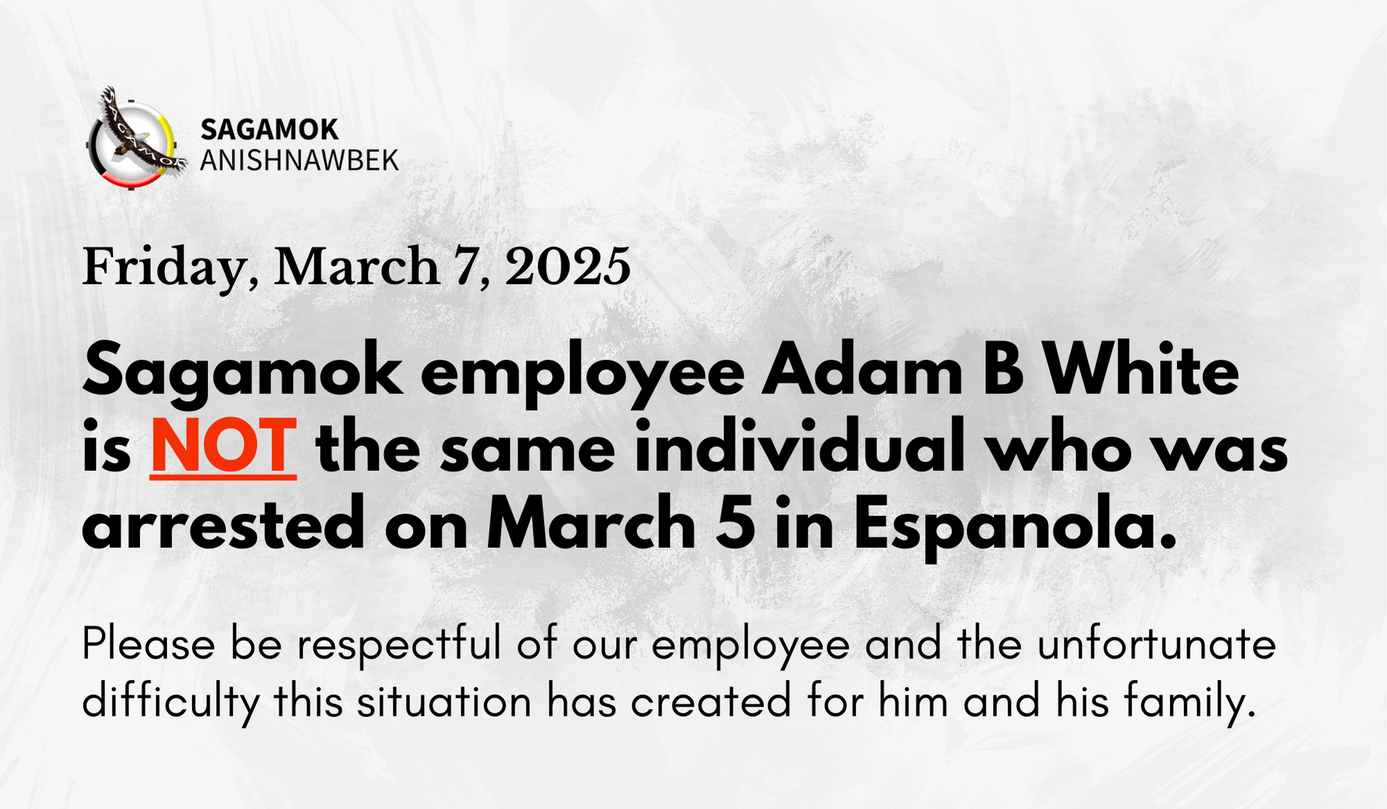 Sagamok employee Adam B White, who works at the Food Bank, is NOT the same individual who was arrested on suspected possession and trafficking charges on March 5 in Espanola, Ontario.