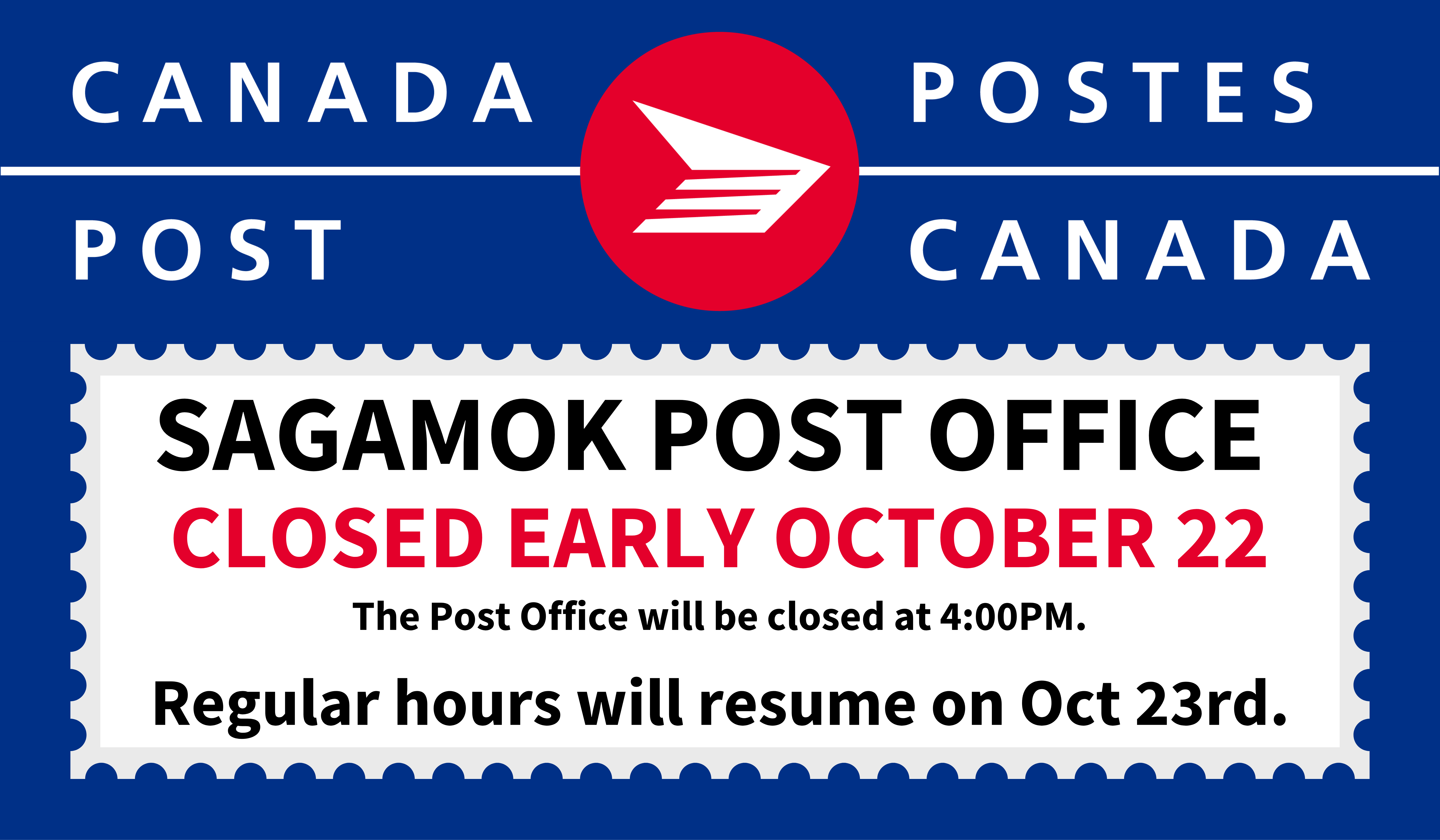 The Sagamok Canada Post will be closed early at 4:00PM on Wednesday, October 22. We apologize for any inconvenience.
