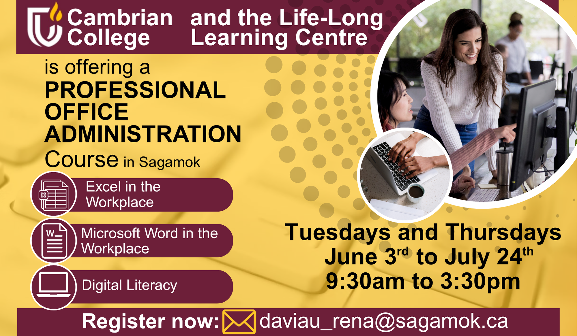 Cambrian College and the Life-Long Learning Centre are offering a Professional Office Administration course in Sagamok.