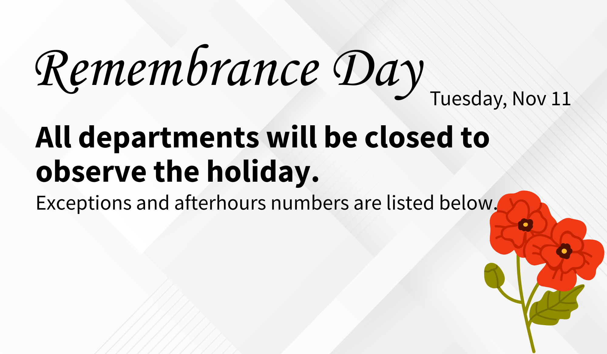 All departments will be closed to observe the holiday.