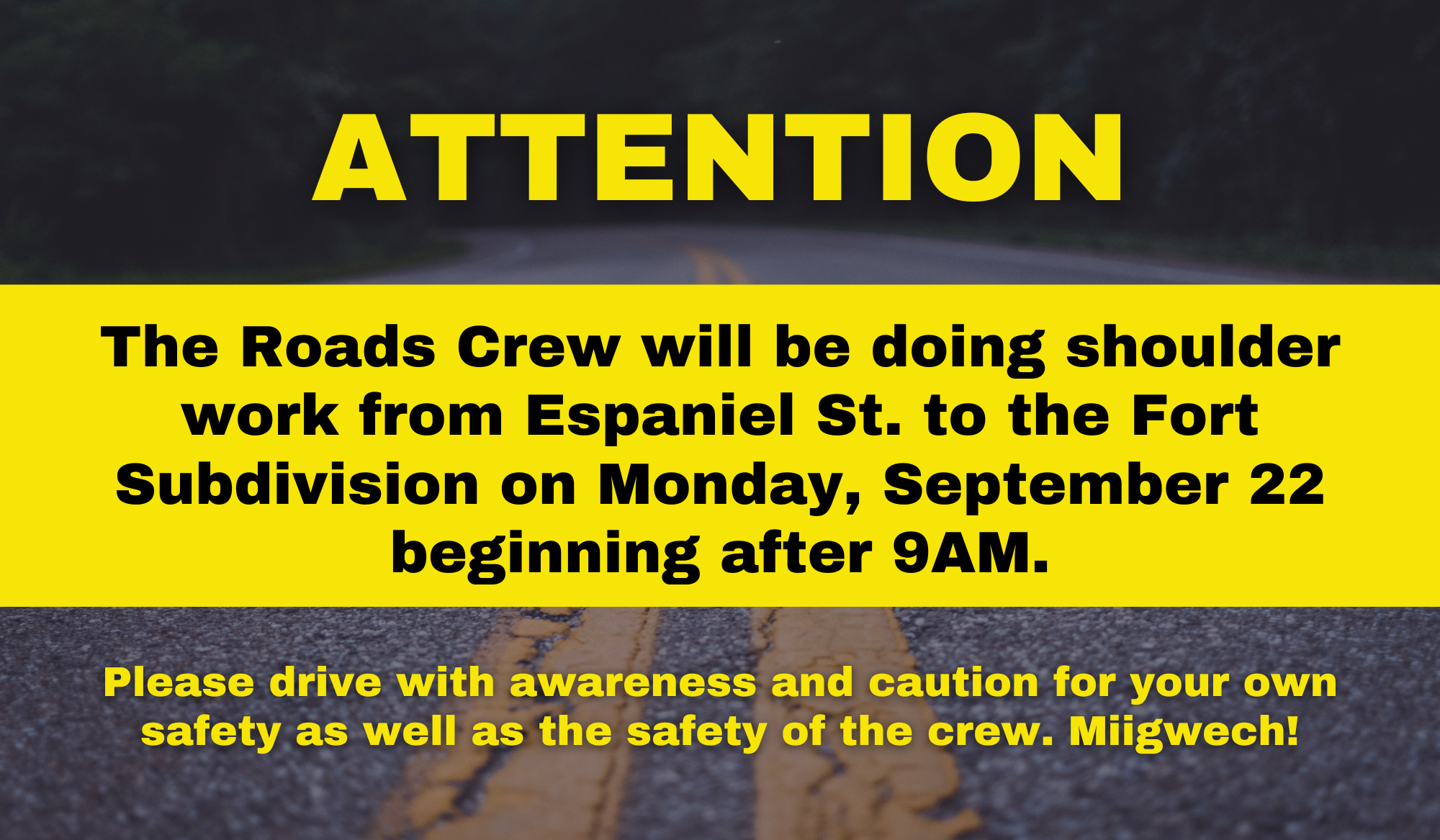 Please drive with awareness and caution for your own safety as well as the safety of the crew. Miigwech!