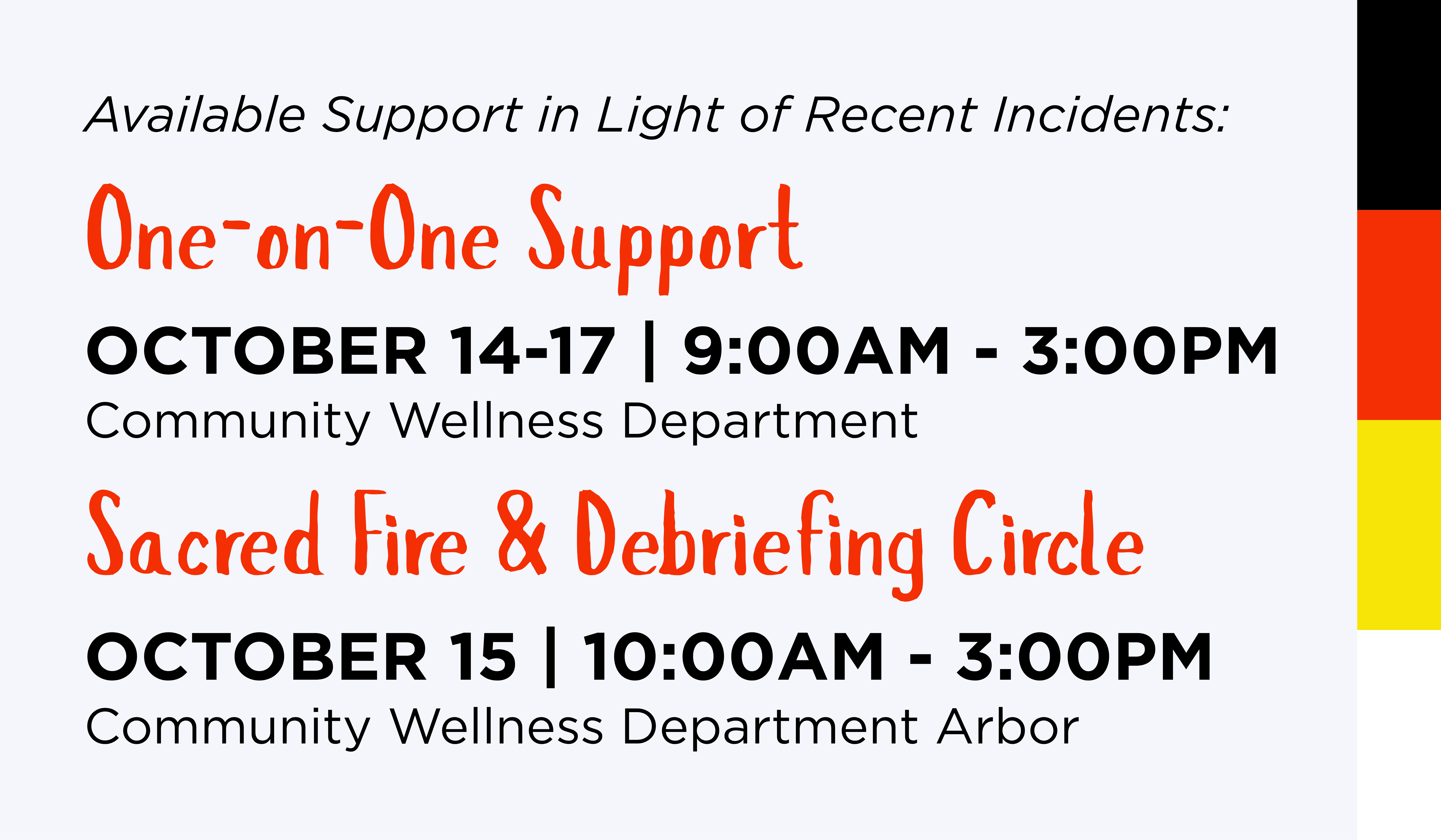 - 1:00PM | Debriefing circle for those who were not directly impacted by the Fall Harvest incident (i.e. at Harvest but not a witness or involved, extended family, etc.)