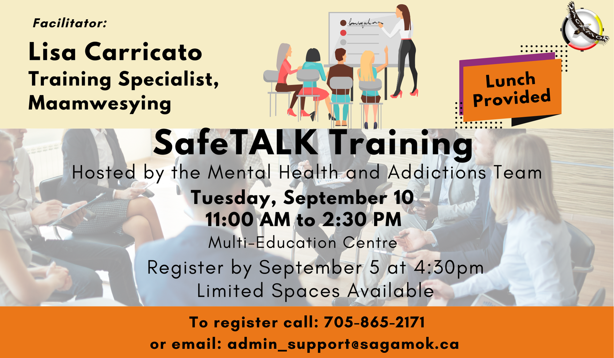 This training is being offered to community members and employees of Sagamok Anishnawbek (16+), as part of our Life Promotion programming in honor of World Suicide Prevention Day. Enhance your skills in recognizing and responding to signs of suicide and how to connect those in need with supports and resources.