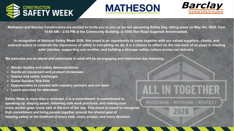 Matheson and Barclay Constructors are excited to invite you to join us for our upcoming Safety Day.