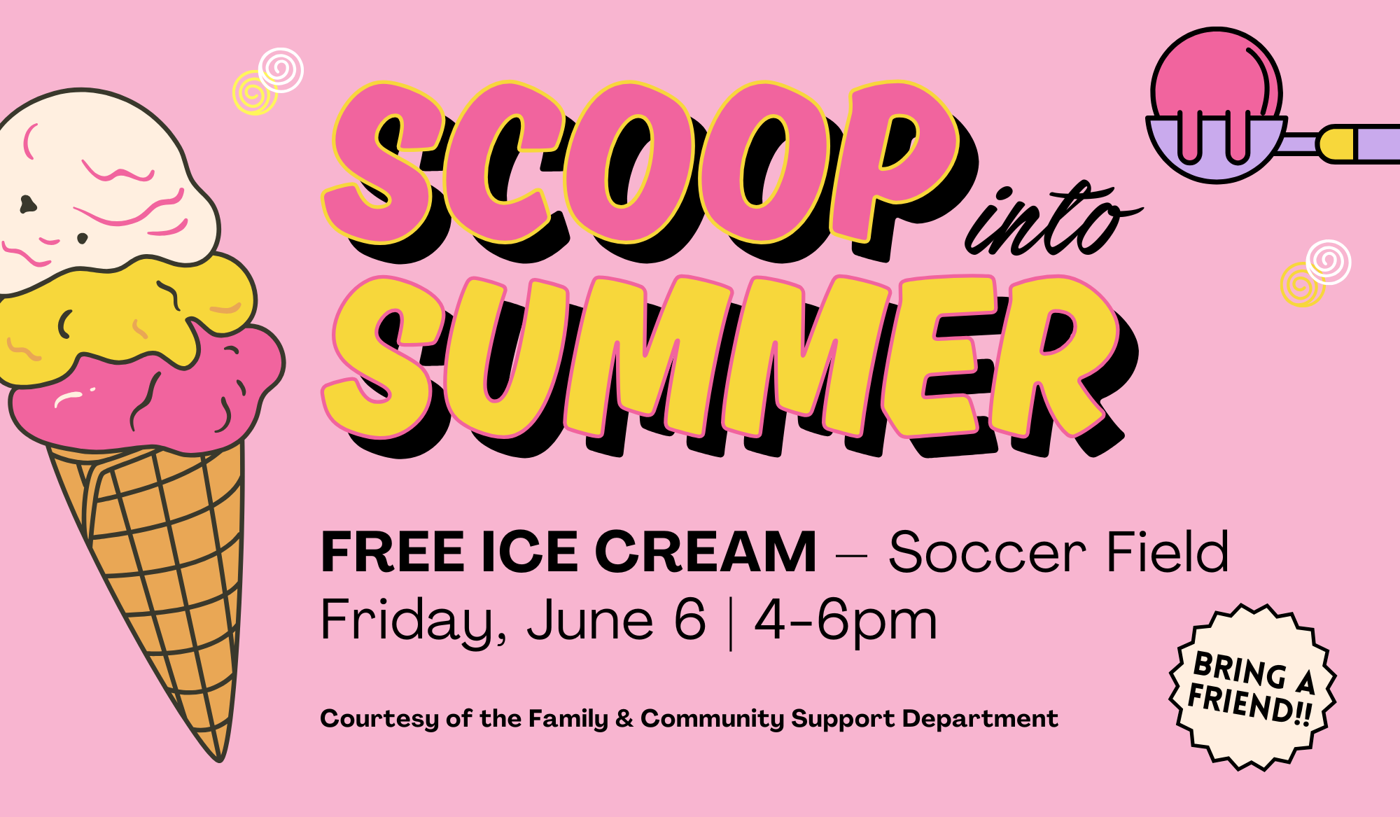 Join us for free ice cream at the soccer field, courtesy of the Family & Community Support Department!