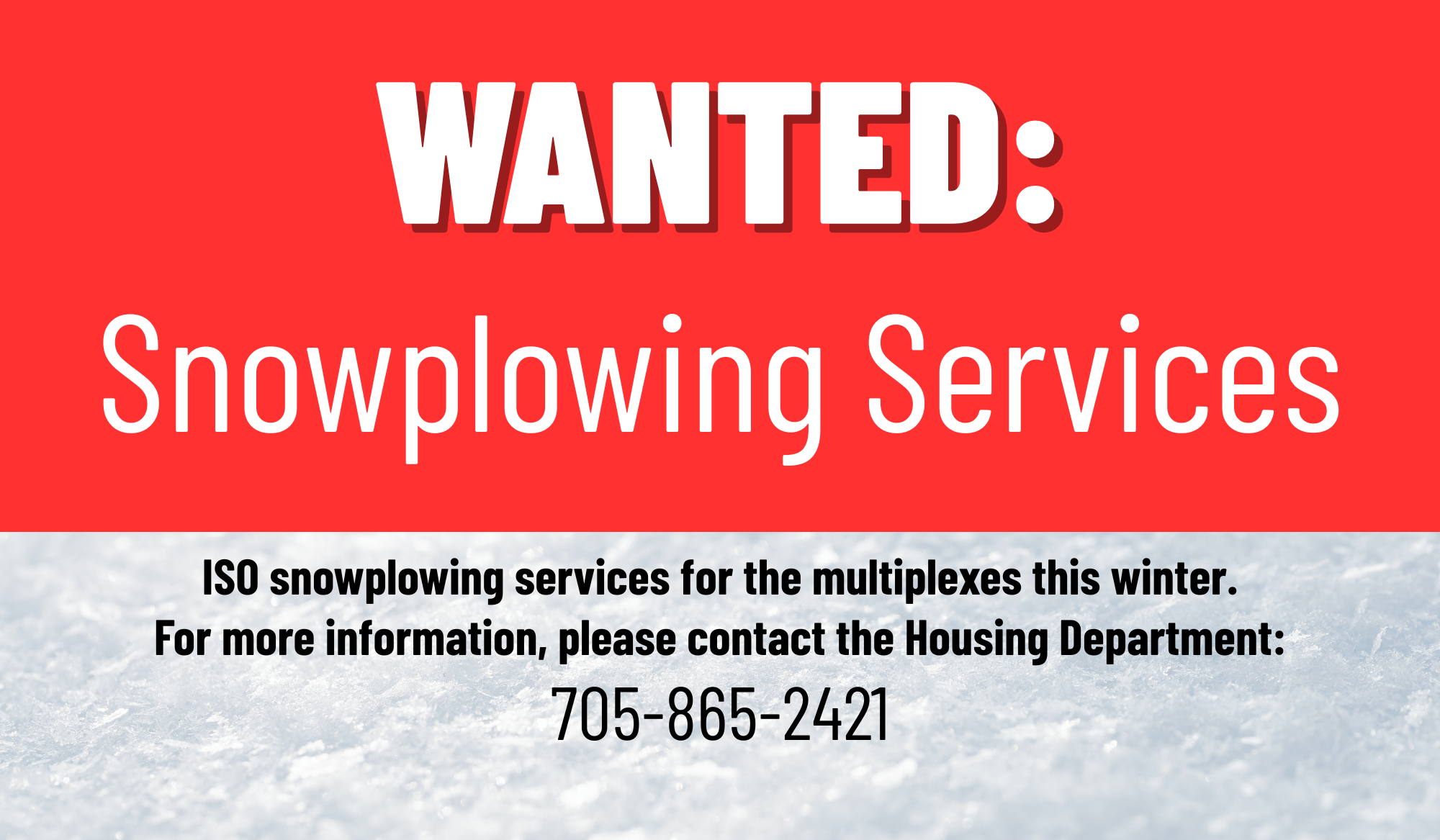 ISO snowplowing services for the multiplexes this winter. For more information, please contact the Housing Department at 705-865-2421.