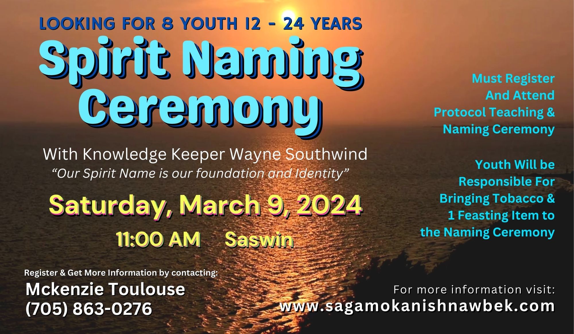 Limit of 8 youth - must register and attend Protocol Teachings before the ceremony (details be given when youth register)