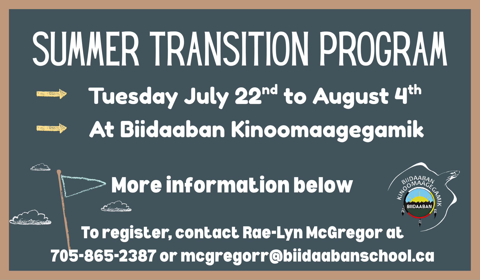 Phone: 705-865-2387 email: mcgregorr@biidaabanschool.ca