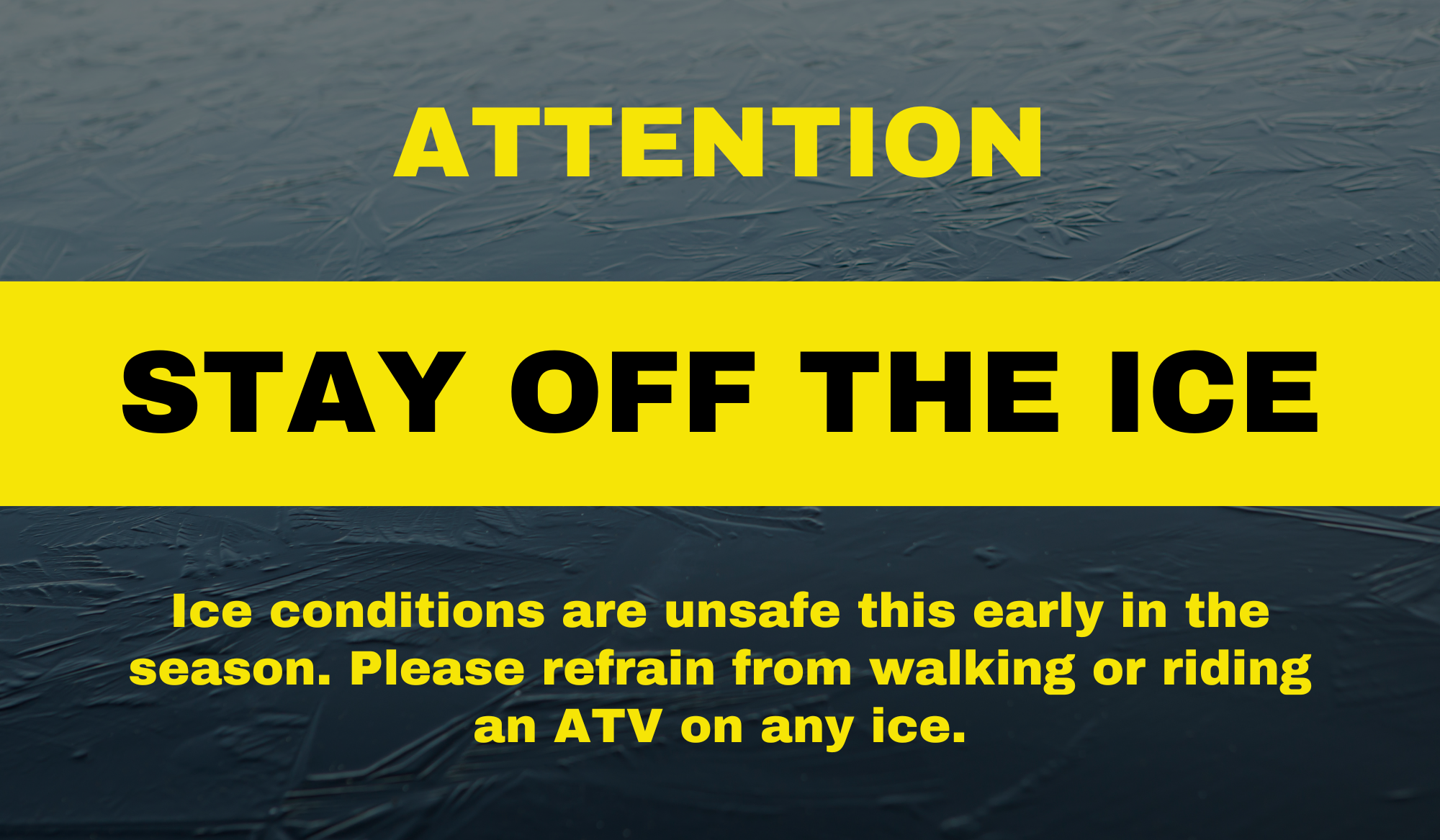 Ice conditions are unsafe this early in the season. Please refrain from walking or riding an ATV on any ice.
