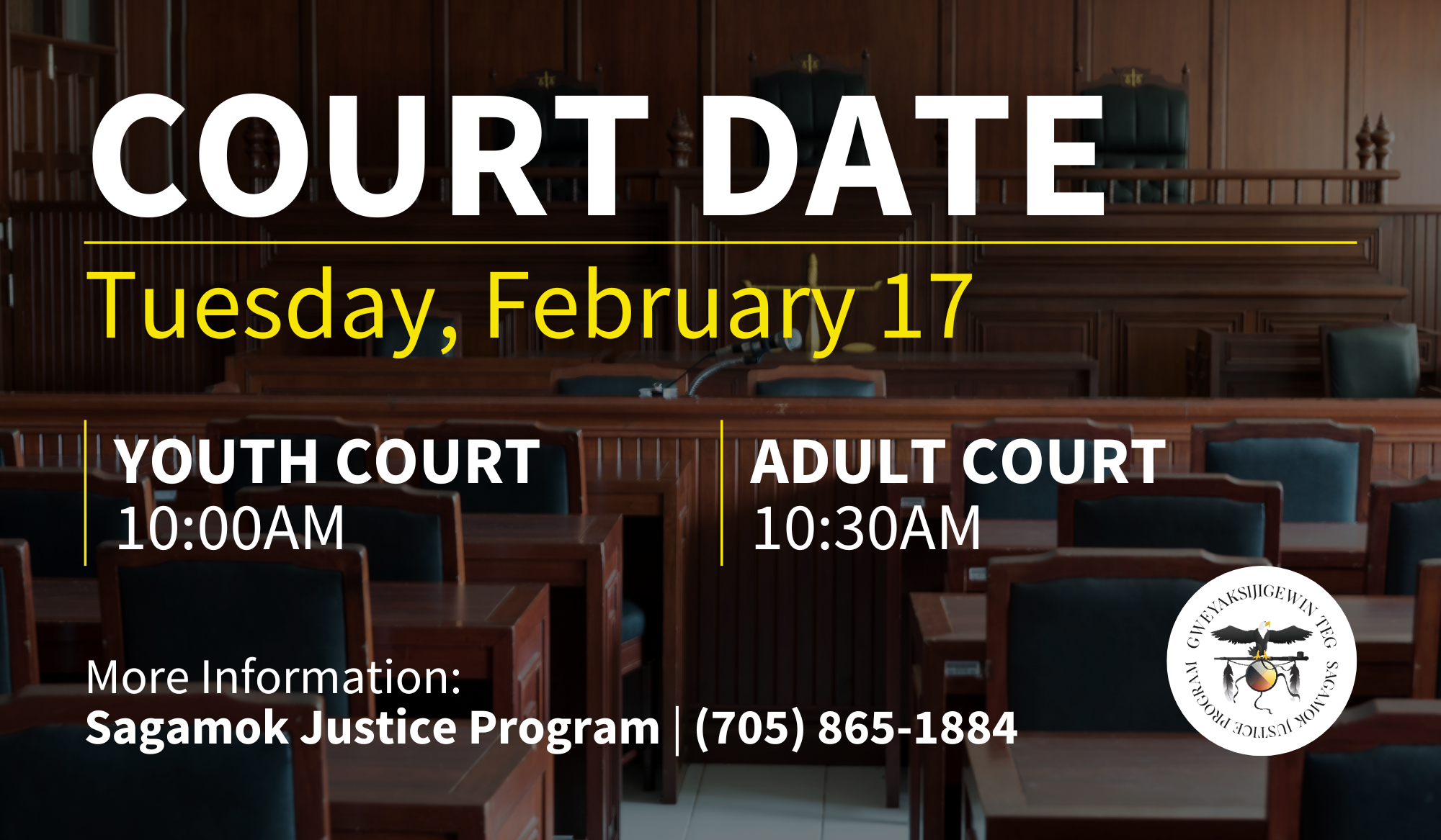 For more information, please call the Sagamok Justice Program (Gweyaksijigewin Teg) at 705-865-1884.