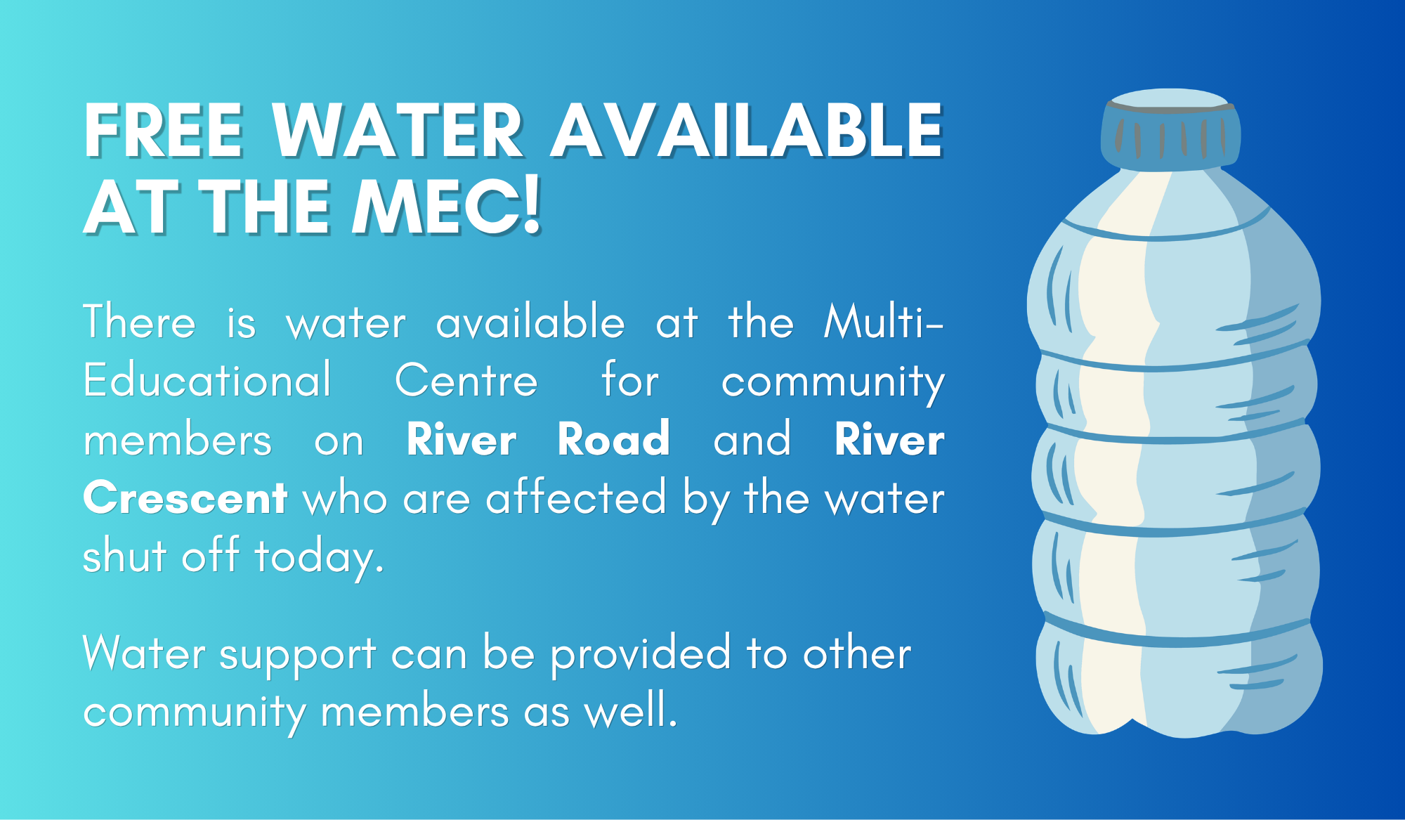 Water is Available at the MEC for Residents of River Road and River Crescent during the Water Shut Off.