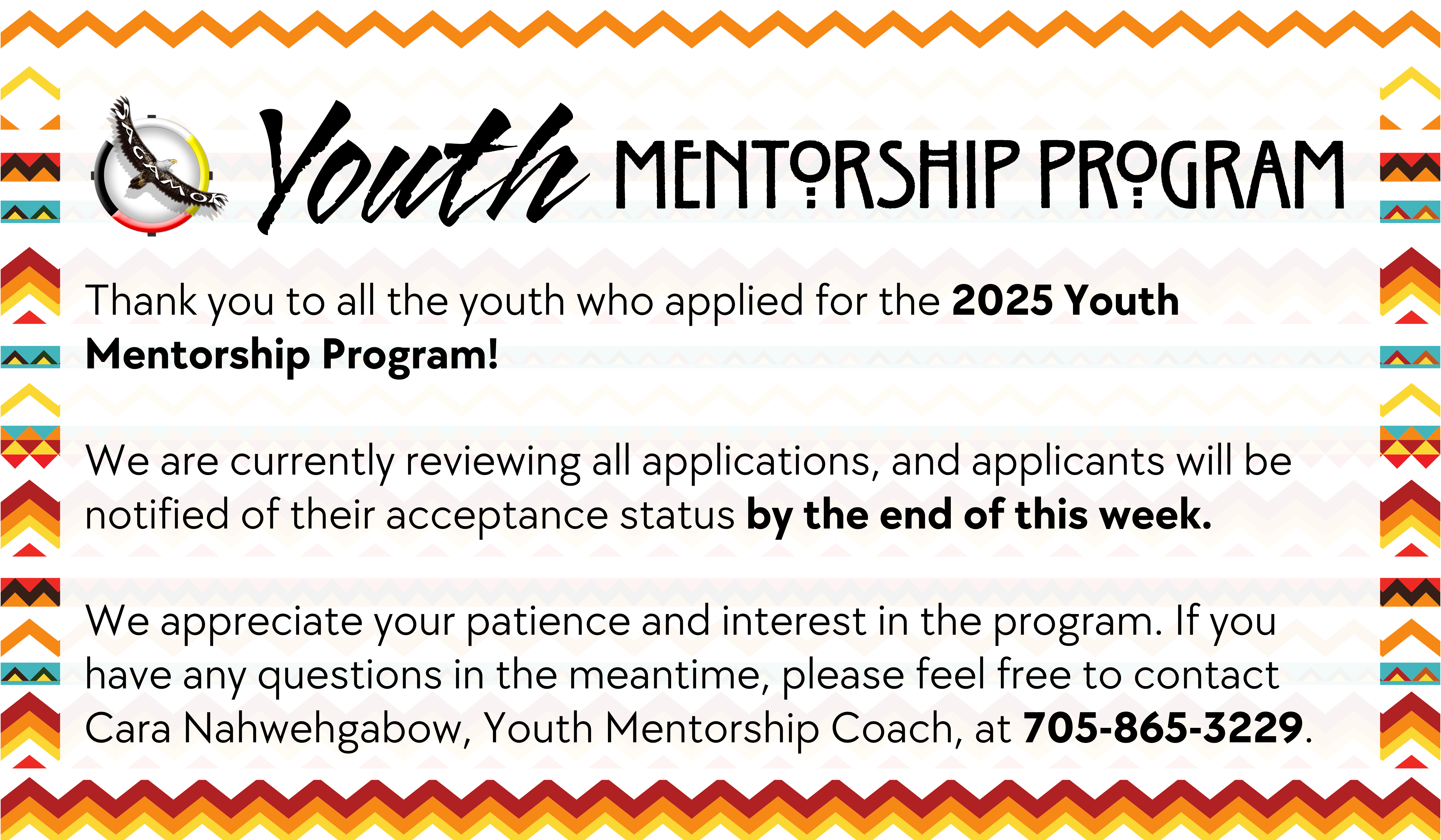 We appreciate your patience and interest in the program. If you have any questions in the meantime, please feel free to contact Cara Nahwehgabow, Youth Mentorship Coach, at 705-865-3229.