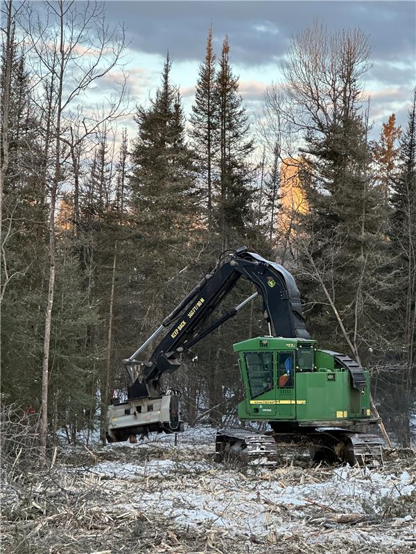 ZEI supported one of its clients this winter by clearing an area in preparation for a new hydro line. The machine used for the project, and pictured here, is a John Deere 753 Feller Buncher that the team converted into a mulcher with the attachment of an FAE 150umm mulching head.