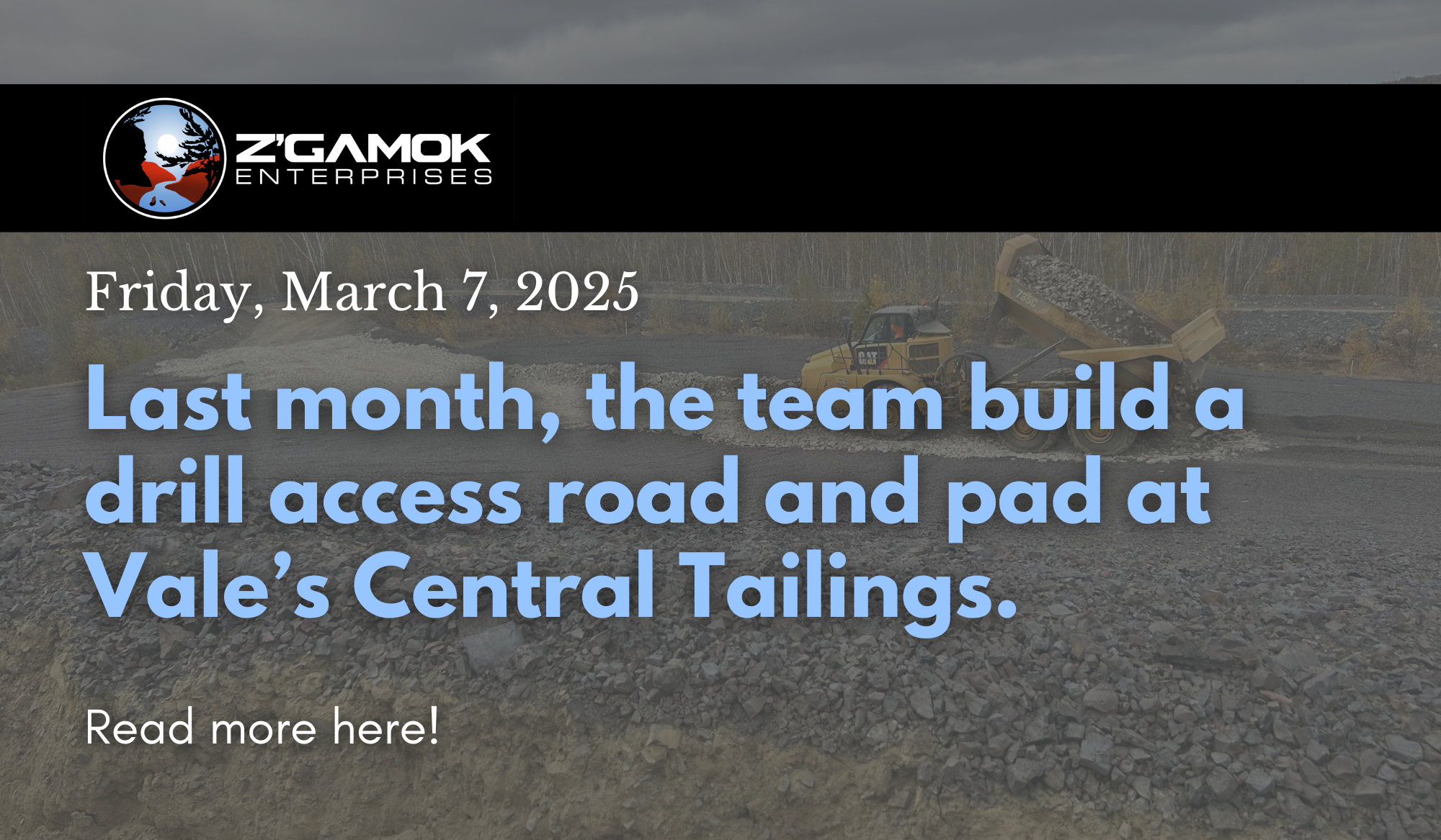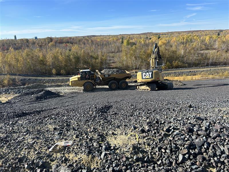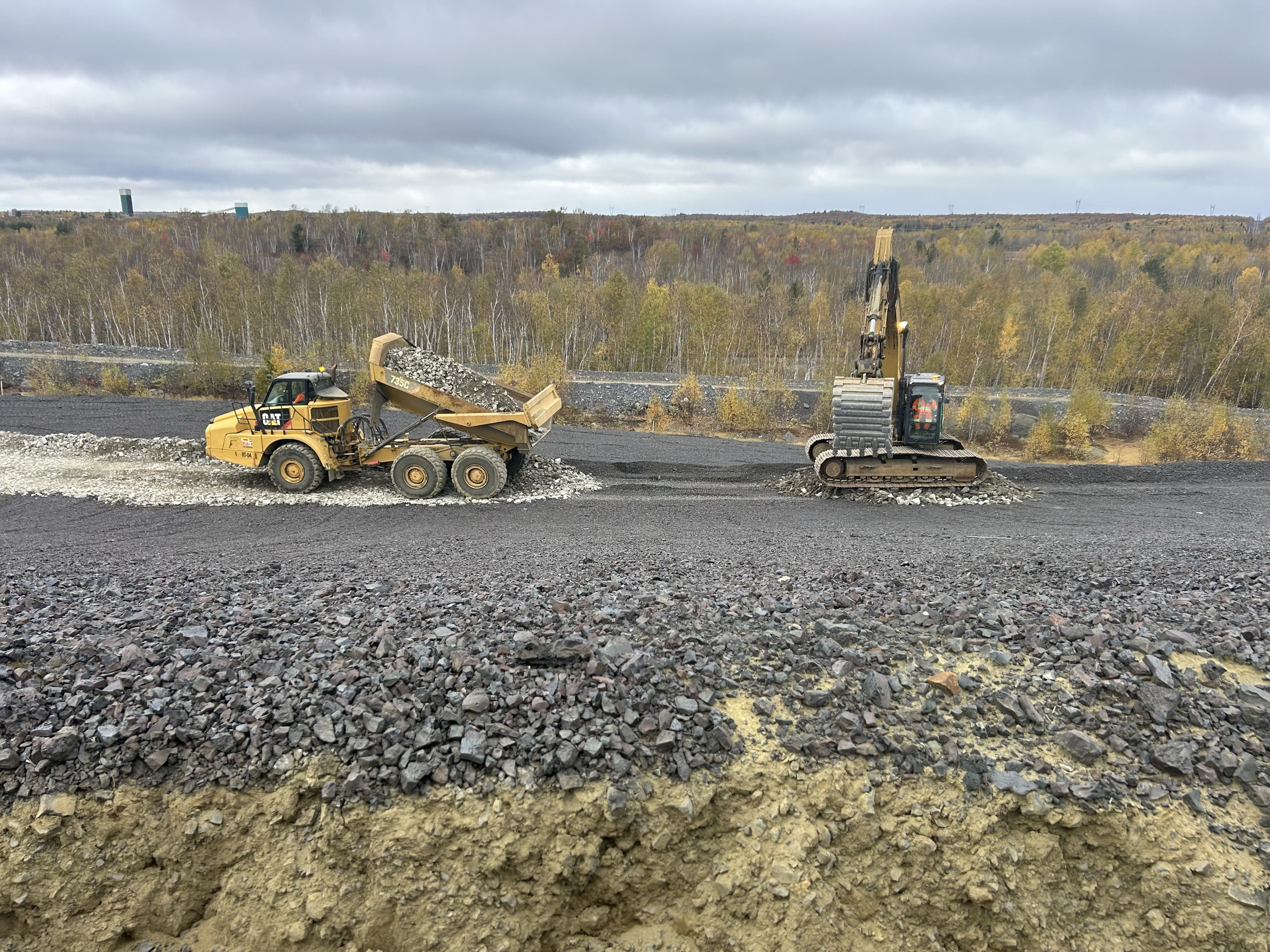Last month, the team built a drill access road and pad along the dam slopes at Vale's Central Tailings. Equipment used was a 1-336 CAT excavator and 2 CAT rock trucks, just a few of ZEI's fleet of large highway vehicles (trucks and trailers), light vehicles and, and heavy equipment.