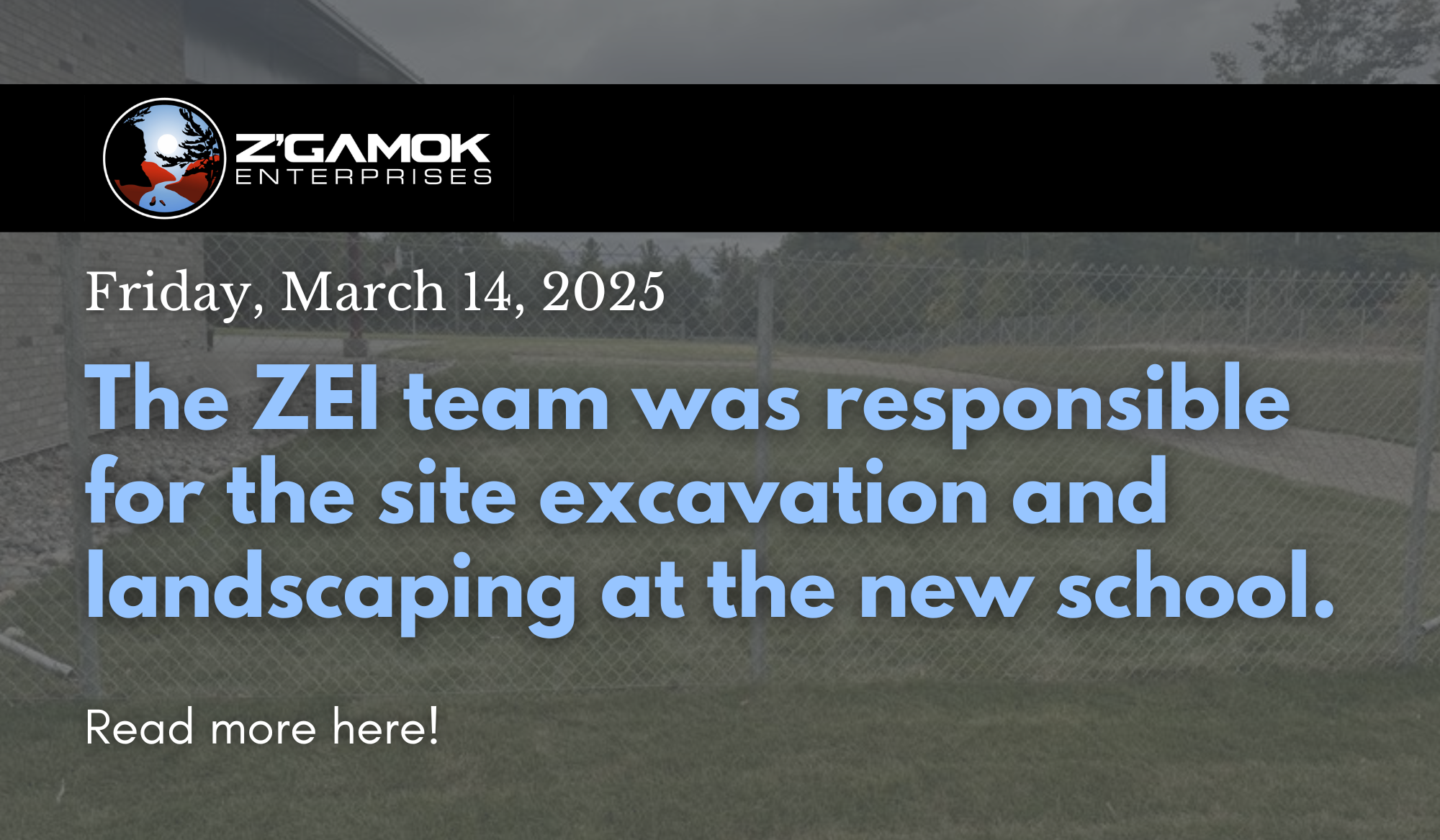 It's March Break at Biidaaban! We're looking back at the new school project, which for ZEI began in 2023 and wrapped up mid-summer last year. Our team was responsible for the site excavation and landscaping for Matheson Constructors. That work included: clearing the lot, earthworks, foundation/parking lot preparation and backfill, installing services, landscaping, and planting sod and trees. It's a proud moment to have been involved in such an important project in the Sagamok community.